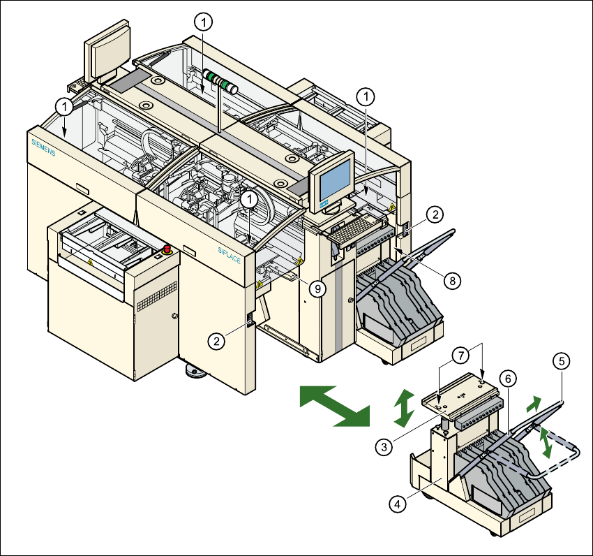 5 오퍼레이터 , 라인 엔지니어 , 서비스 엔지니어 사용자 매뉴얼 SIPLACE HS-60 5.9 컴포넌트 트롤리 소프트웨어 버전 SR.503.xx2003 년 7 월 미국판 120 5.9 컴포넌트 트롤리 5.9.1 컴포넌트 트롤리의 결합 및 분리에 관한 안전 지침 경고 5 장비가 작동 중일 때 에는 컴포넌트 트롤리와 실장 시스템 프레임 ( 항목 1 참조 ) 사이에 손 을 넣 지 마십 시오…