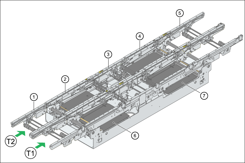 ( 전송 방향에서 볼 때 ) 우측 전송 트랙은 "Transport 1" 로 지정되고 좌측은 "Transport 2" 로