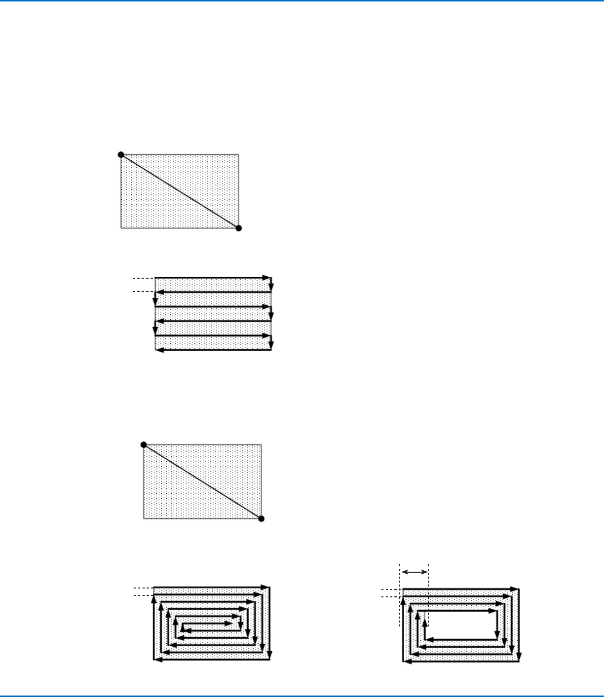 此指令使针头沿一个曲折式、螺旋形路径从矩形外面移动到中心,从而填充设定区域。输入一个“填充区域矩形”指令后,在待填充