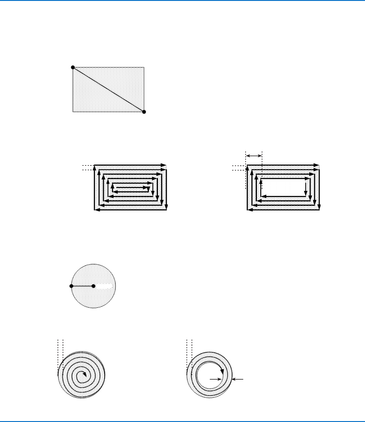 此指令使针头沿一个旋转螺旋形路径从矩形中心移至矩形外边,从而填充一个矩形区域。输入一个“填充区域矩形向外”指令后,在