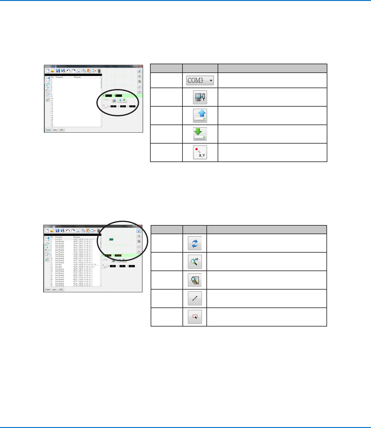 E系列自动点胶系统 121 www.nordsonefd.com/cn china@nordsonefd.com +86 (21) 3866 9006 诺信 EFD 在全球范围内销售专业点胶系统并提供技术支持服务 5.坐标和连接状态区域 5.坐标和连接状态区域 点击位置图标时,坐标字段将显示点胶针头的当前坐标。端口选择下拉菜单和图标用于连接或断开系统到PC和传输程序 的连接。 项目 项目 图像 图像 功能 功能 端口选择下 拉菜单 选择…
