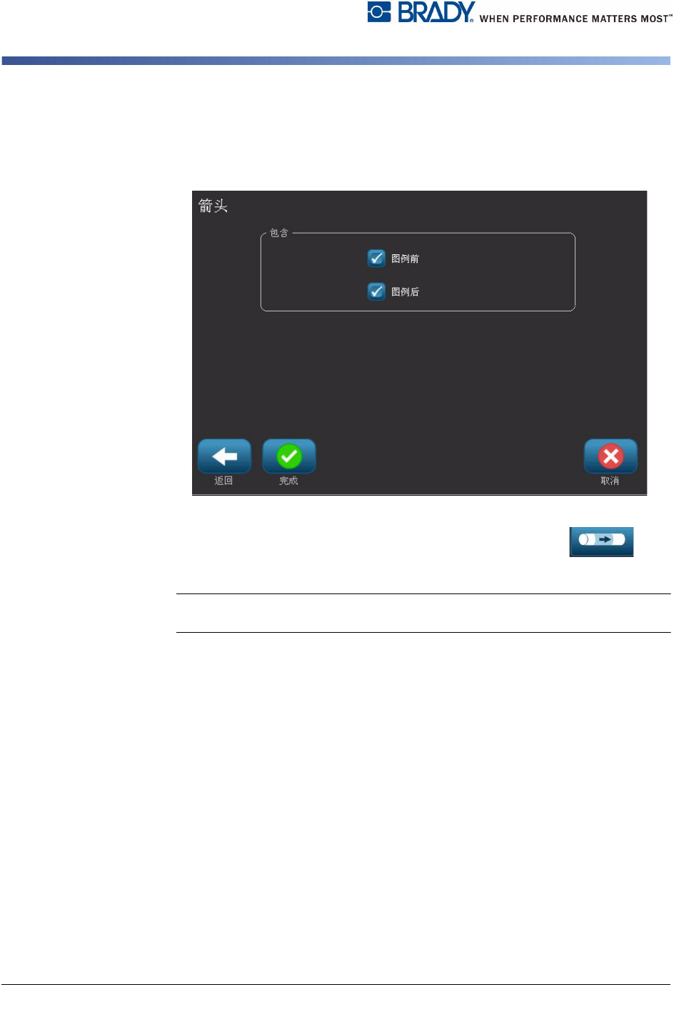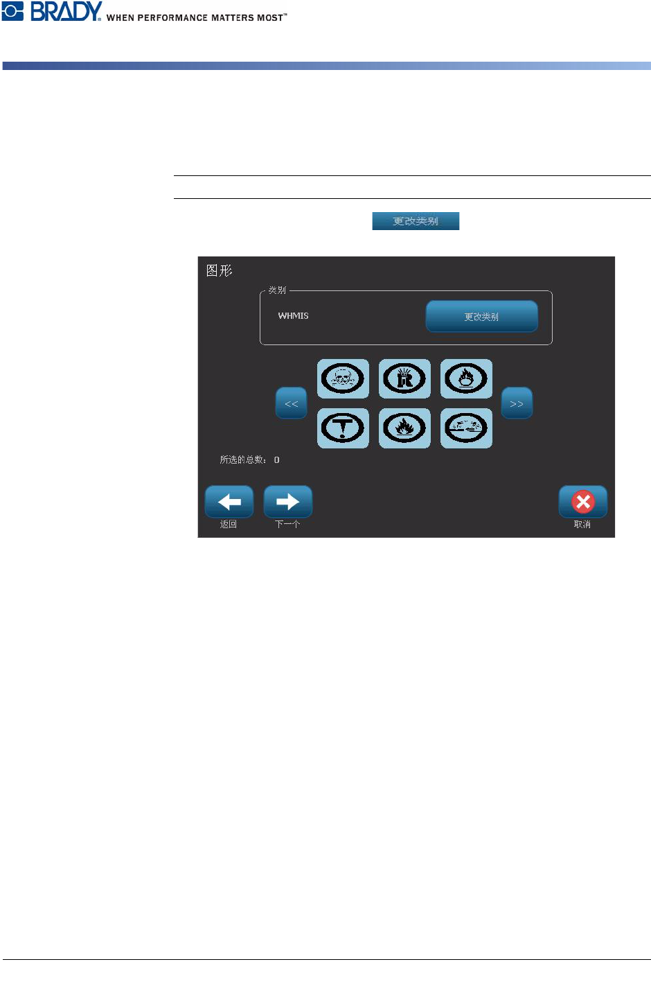BBP ® 31 标志和标签打印机 用户指南 C-5 管道标识 创建管道标识标签 5. 在 图形 对话框中: a. 触摸想要包含在标签中的图形。 所选图形周围出现白线, 并且所选图形的 总数将立即更新。 最多允许选择 4 个图形。 Note: 要取消选择图形,可以再 次触摸该图形。 b. 如果需要,可以按 更改类别 从不同的图形集中选择。 可以 从多个类别中选择图形。 6. 选择 下一步 。