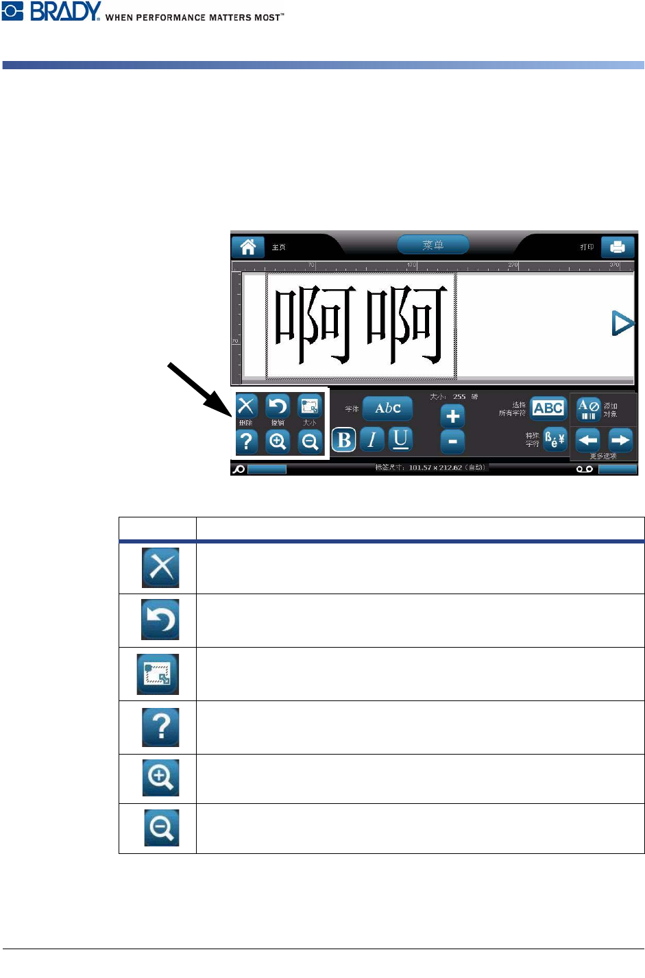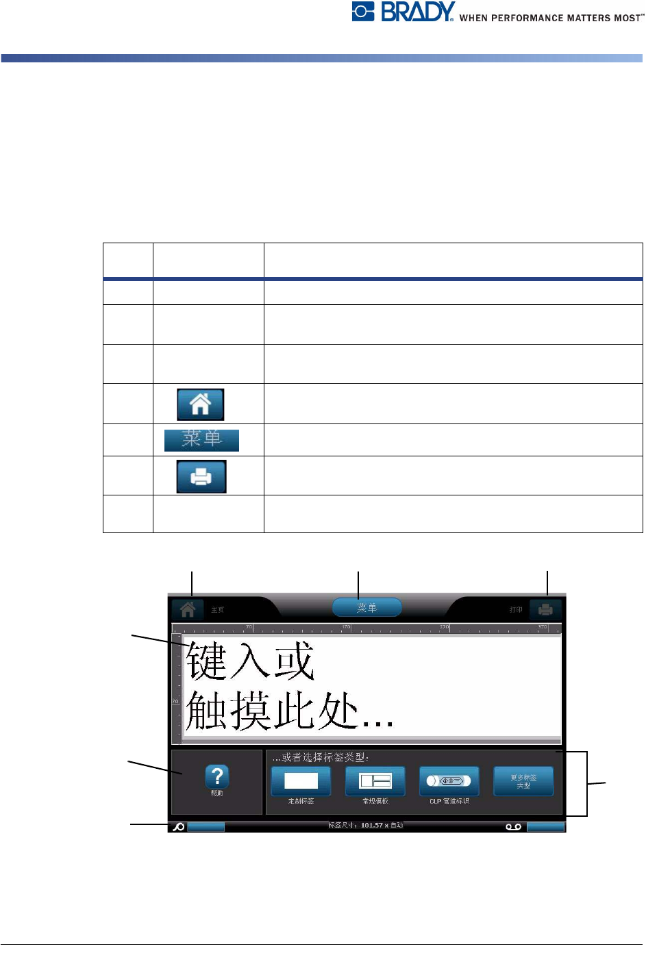 1-4 BBP ® 31 标志和标签打印机 用户指南 关于菜单、对话框和屏幕 主页 关于菜单、对话框和屏幕 以下信息说明 BBP ® 31 标志和标签打印机 系统中使用的菜单、对话框和屏幕。 主页 首次启动打印机时,将自动显示 主页 。 主页 的主要内容有: 显示当前标签大小和剩余介质及色 带数量的指示器。 根据选定的选项,提供 “ 对 象调整大小 ” 、 “ 删除 ” 、 “ 撤销 ” 、 “ 放大 / 缩小 ” 和 “ 帮助 ” 按…