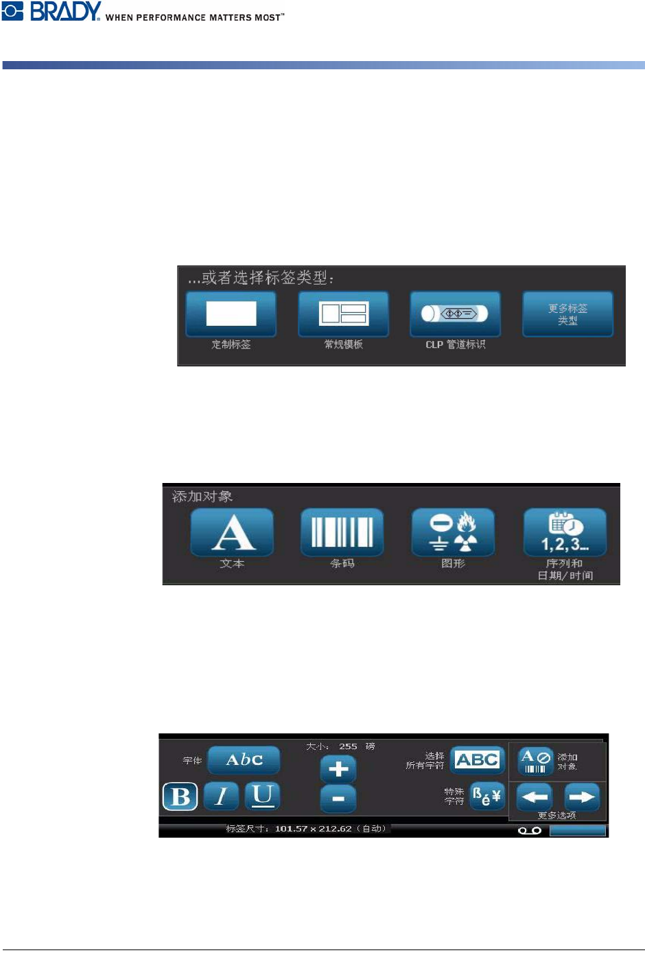 1-8 BBP ® 31 标志和标签打印机 用户指南 按钮操作 控制面板 按钮操作 这些按钮操作可以在整个系统中使 用。 除非必要,假定已了解这些按钮操作且不会 包含在各操作步骤中。 • 帮助 :通过触摸帮助按钮随时可用。 您也可以查阅随打印机附带的 产品光 盘上的用户指南。 • 主页 :在应用程序的任意位置选择该按 钮可以返回到 主页 。 可能会提示 您保存当前的标签文件。 • 取消 : 在大多数情况下,可以随时按 “ 取消 ” 按钮…