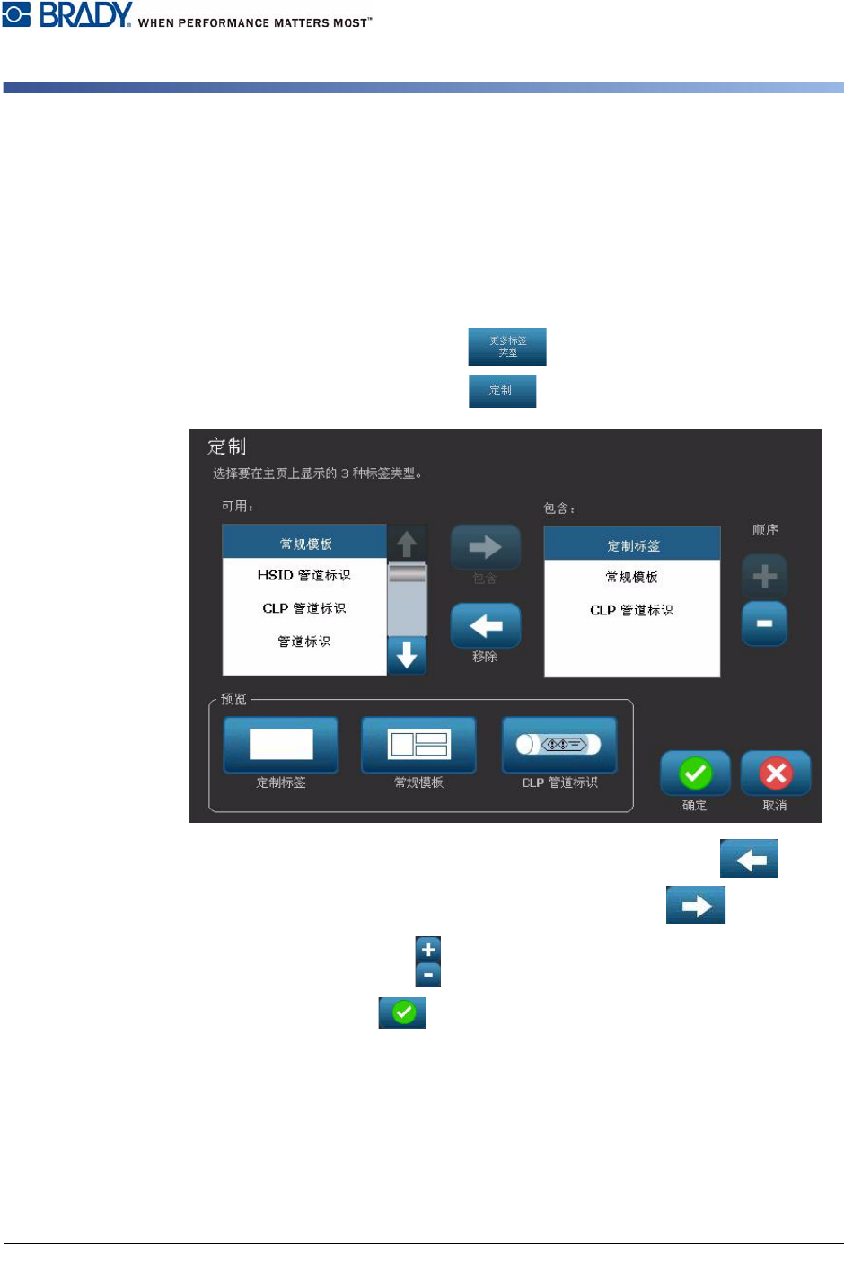 BBP ® 31 标志和标签打印机 用户指南 2-19 定制主页默认设置 从 PC 创建和打印标签 定制主页默认设置 您可以选择要在主页上显示的三 种标签类型。 选定标签类型将设置为 打印机的默认 设置。 预览 区域将立即反映出这些更改。 要选择标签类型默认设置 : 1. 从 主页 中,选择 更多标签类型 。 2. 从 标签类型 对话框,选择 定制 。 定制 对话框打开。 3. 从 已包含 列表中,选择不希望显示的标 签类型,然后选择 …