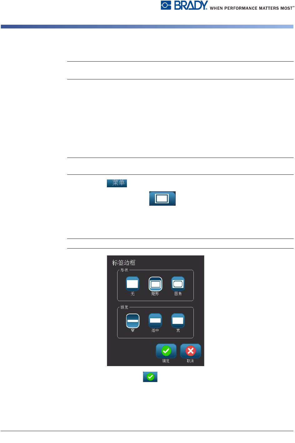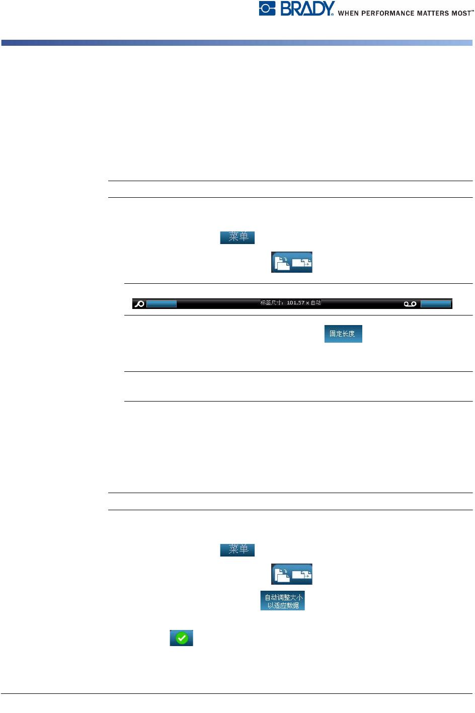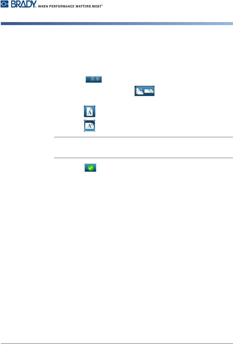 BBP ® 31 标志和标签打印机 用户指南 3-5 设置标签属性 方向 方向 使用本节步骤可设置标签的方向 为纵向或横向。 即使正在 编辑器 中编辑的标签也可 以更改标签方向。 要设置标签方向: 1. 选择 菜单 。 2. 在菜 单列表中,选择 大小和方向 。 3. 在 标签选项 对话框中,选择其中一个方向按钮 以选择标签的方向: • 纵向 : 从上到下为长。 • 横向 : 从左到右为长。 Note: 如果当前数据不适合选定长度,则将…