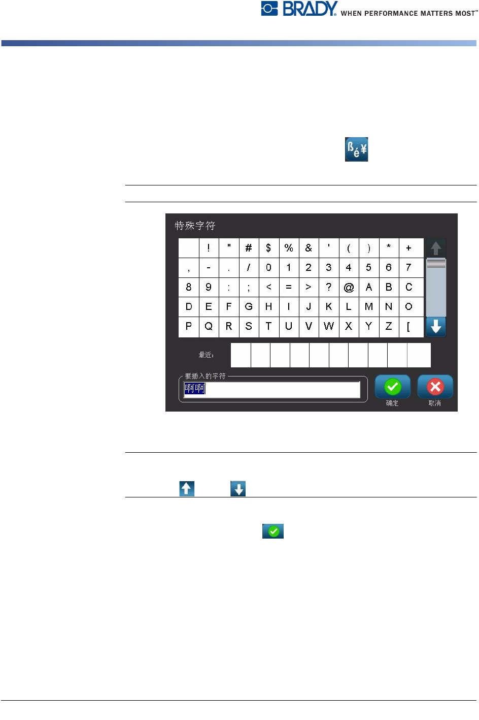 • 按向上 或向下 箭头在可用字符间滚动。