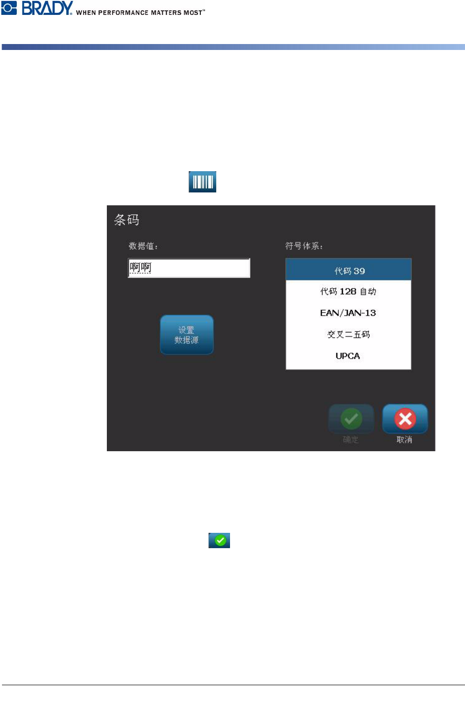 BBP ® 31 标志和标签打印机 用户指南 4-19 使用条码 更改条码 使用条码 更改条码 要更改条码: 1. 在 编辑器 中,选择一个条码对象。 2. 选择 更改条 码 。 3. 在 条码 对话框中,更改所需的选项: 昞 t 数据值 昞 t 符号体 系 昞 t 设置数据源 (可选) 。 请参 阅 第 4-31 页的 “ 将文本或条码转换为可变 数据 ” 以了解详细信息。 4. 完成后,选择 确定 。