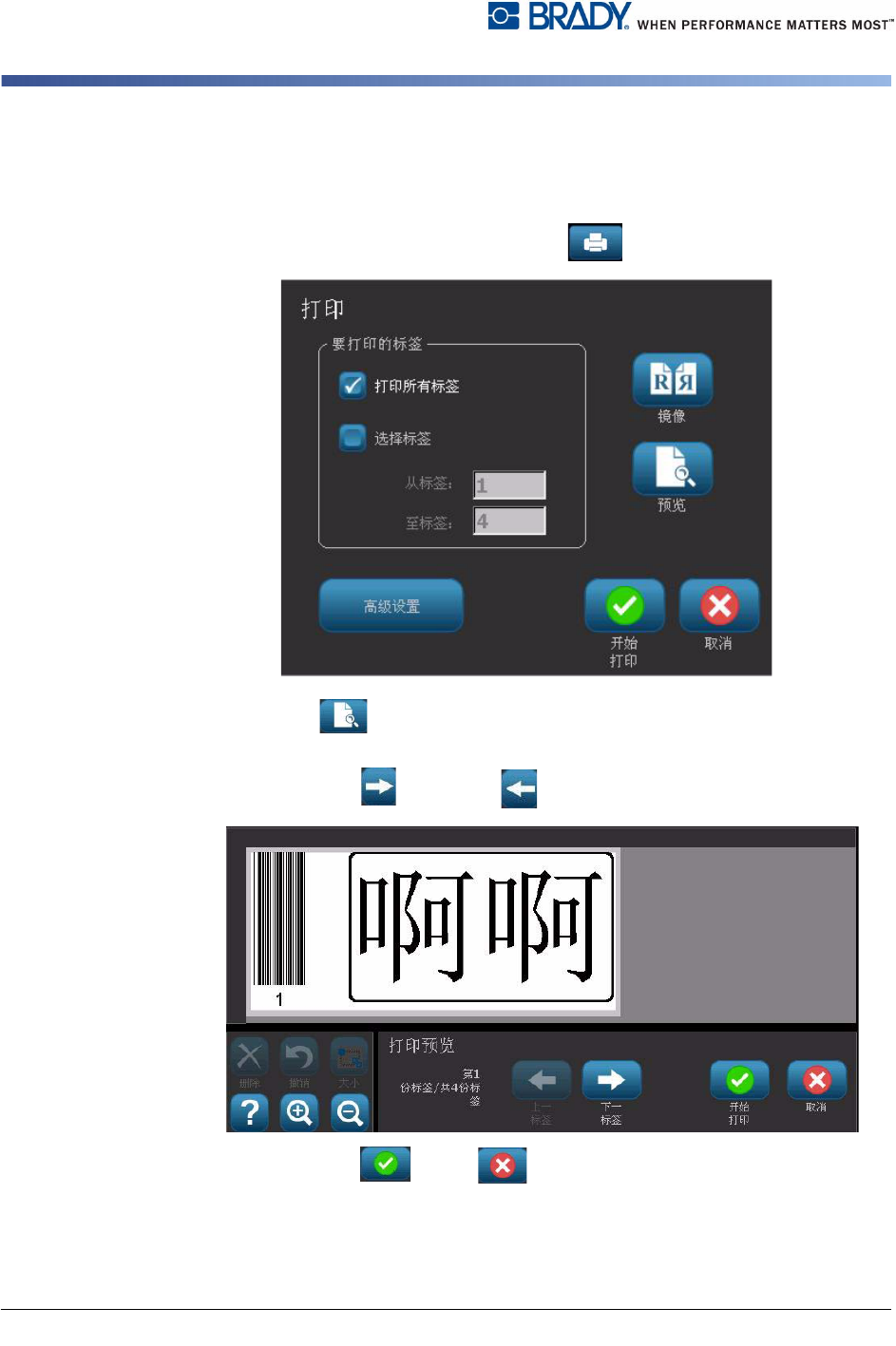 BBP ® 31 Sign & Label Printer User Guide 5-1 5 打印您的标签 预览标签 根据标签是标准标签还是序列化 标签, “ 预览 ” 选项可能有所不同。 预览不含序列化对象的标签 要预览不含序列数据的标 签: 1. 在 编辑器 中有定义的标签时,选择 打印 。 2. 从 打印 对话框,选择 预览 。 显示整个标签以供预览。 3. 选择 开始打印 或 取消 。