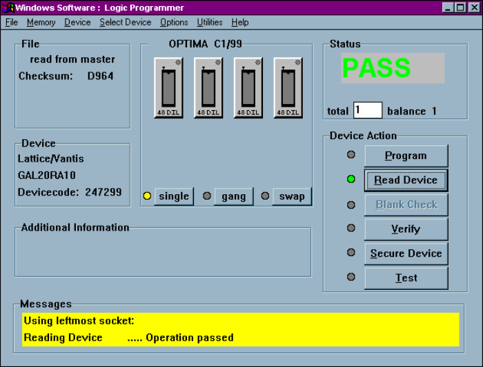 OPT IMA PAL SO FTW ARE Opti ma User M anual 112 Device>Read This selection reads the contents of the devi ce inserted in the sock et and stores it in RA M memory. A ft er the data has been read into memory, the dev ic…