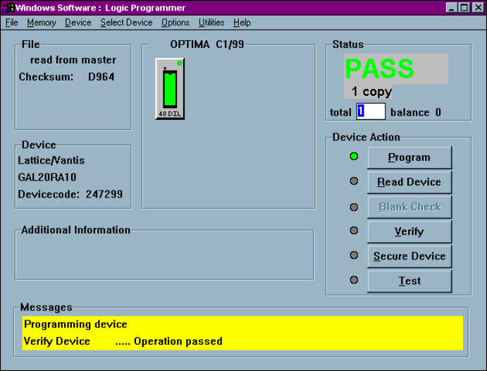 Programming screen displays the word PASS: