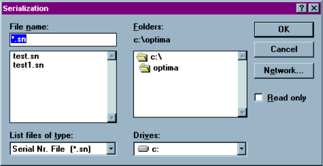 OPTIMA PROM SOF TW AR E Opti ma User M anual 75 other than *.sn, select A ll (*.* ) from the Li st files of type pull -dow n menu in the low er left of the window . 3. Sel ect < OK >. A S erialization O ptions scre…