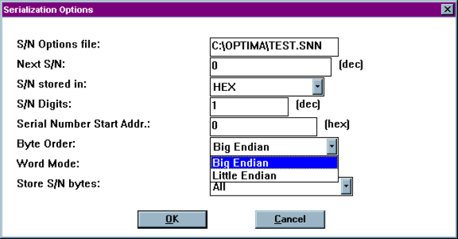 OPTIMA PROM SOF TW AR E Opti ma User M anual 77 x By te Ord er —Used to sel ect the order that the serial number data is pl aced in the devi ce as related to the dat a file; choices i nclude Bi g Endi an (Hi by te/Lo by …
