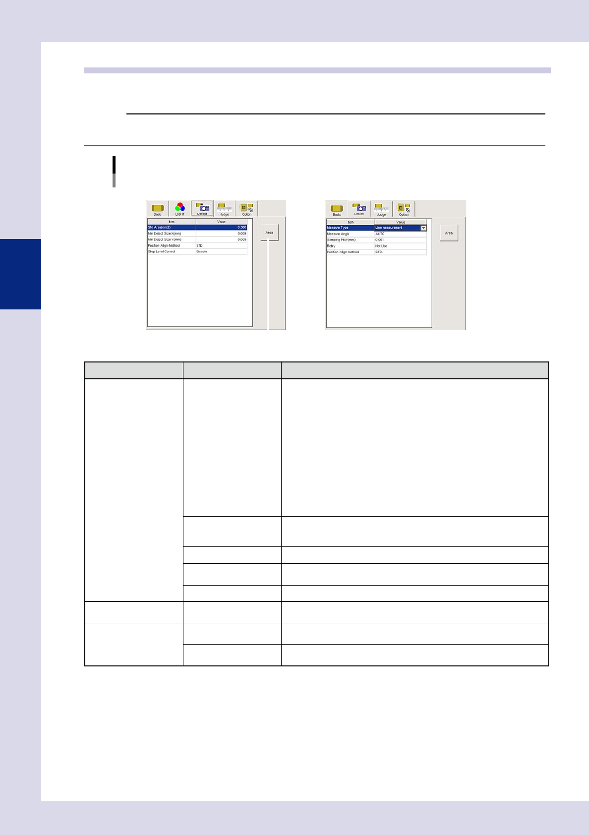 3-4 3 Step screen 1.3 Detection conditions parameters Sets the inspection conditions for the object to be inspected in the area recognized in red as the inspection object. TIP The displayed parameters differ depending on…