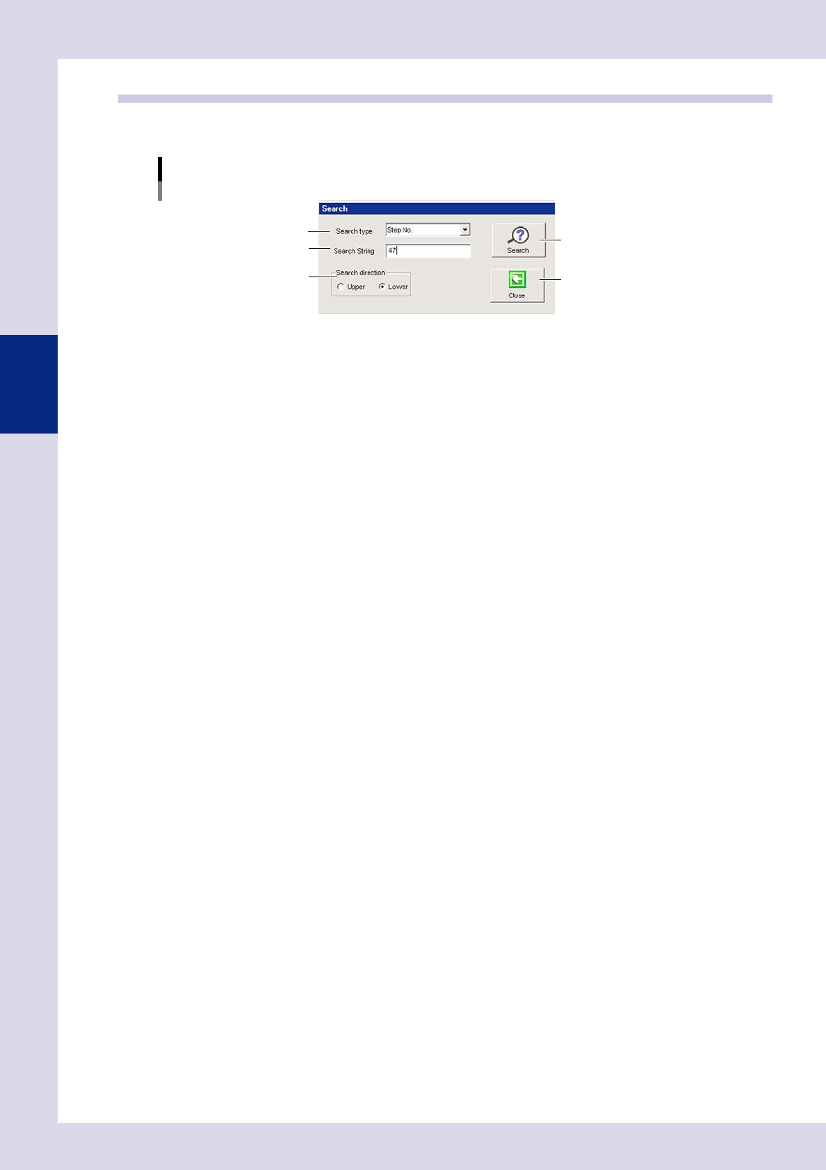 By pressing the [Search] button at the "Utility" tab, a "Search" screen appears. This screen is used to search for