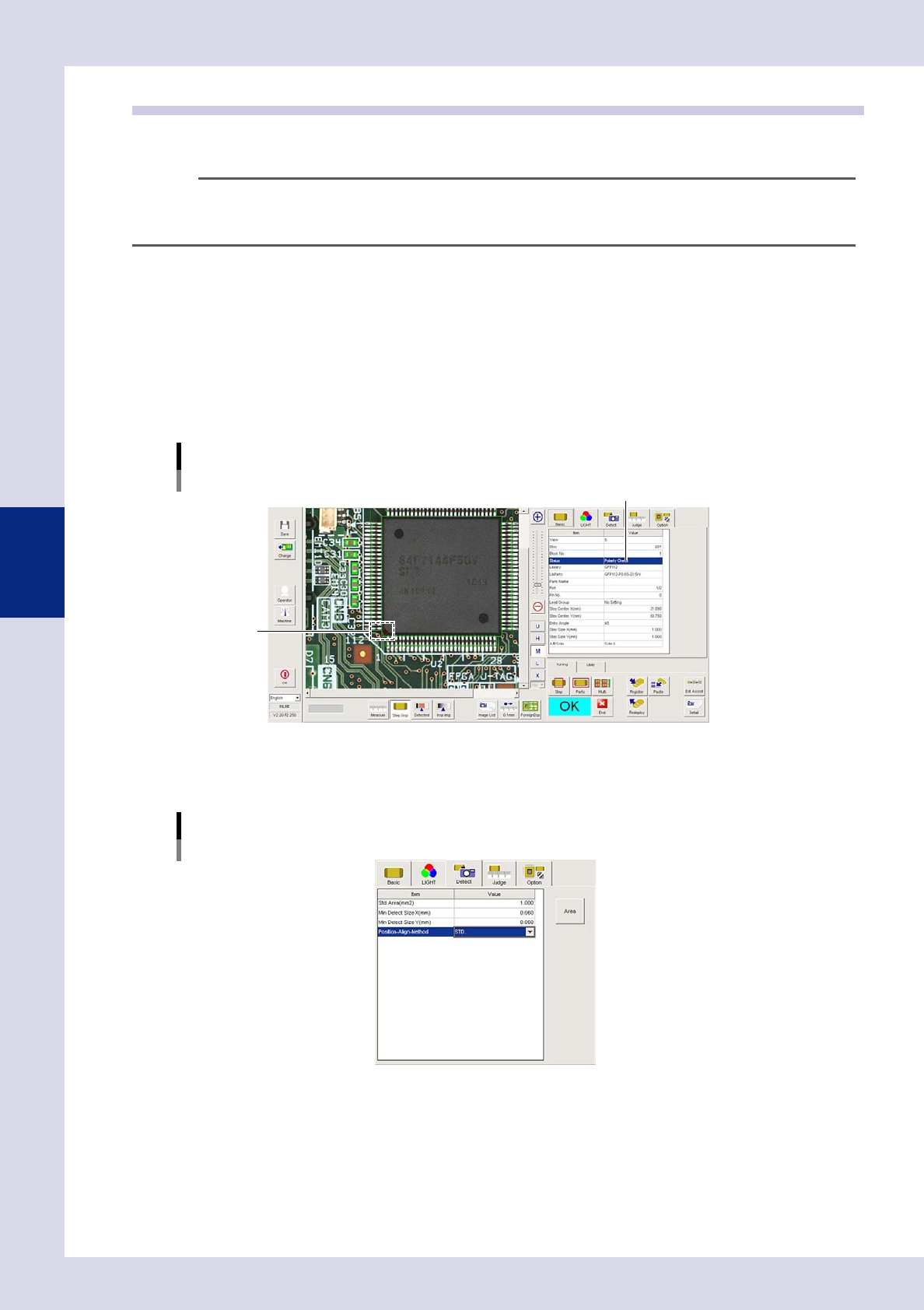 4-8 4 Inspection status 1.3 Polarity Check T his inspection status is used if inspecting the parts mounting angle by recognizing polarity marks on IC partss and so on. TIP • "BrightnessLevel"or"Compari…