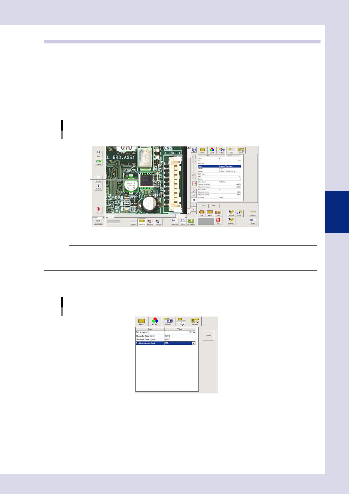 4-11 4 Inspection status 1.4 Character Recognition T his inspection status is used if inspecting differences in parts types or the parts mounting angle for IC parts and so on by recognizing c haracters on parts. Only upp…
