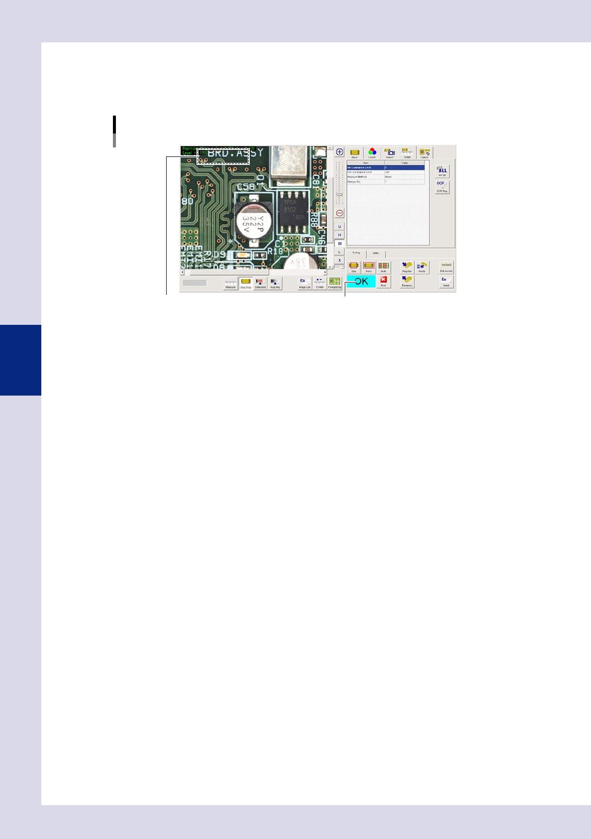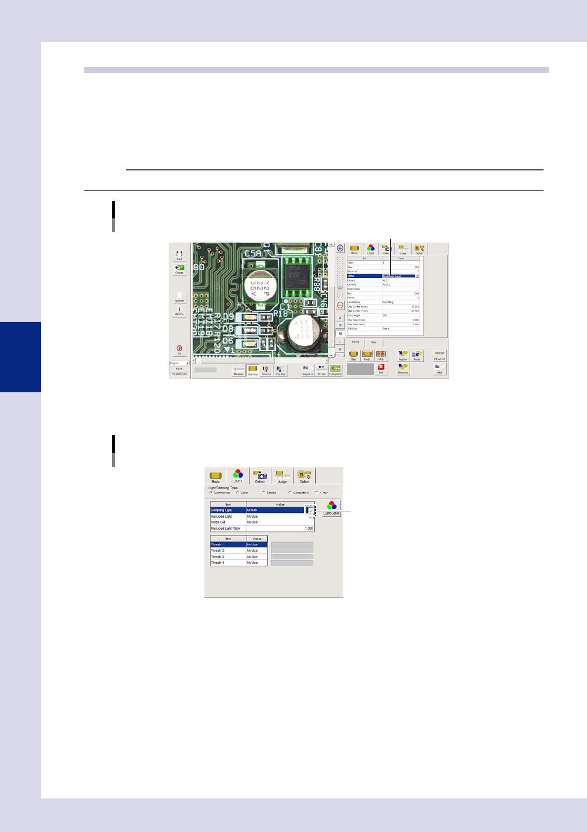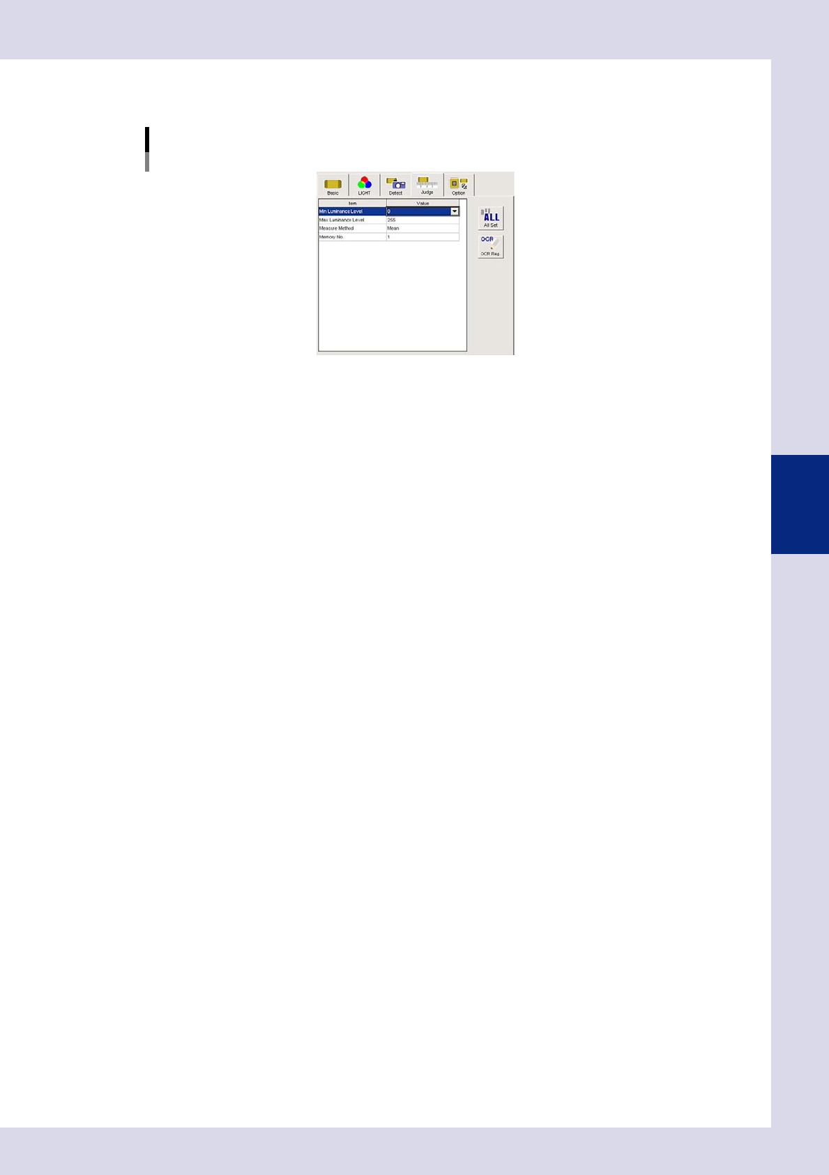 4-23 4 Inspection status 3 Set the "Judge" par ameters. Open the "Judge" tab and set the following param eters. "Judge" parameters Status: Brightness Level 24434-P6-00 Minimum Luminance Leve…