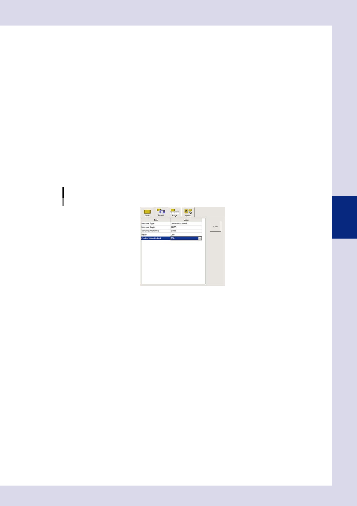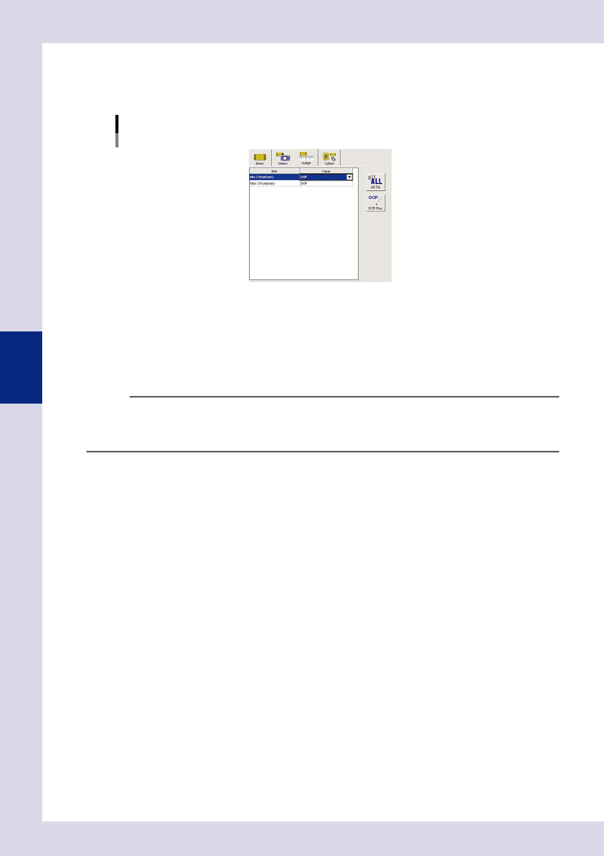 4-44 4 Inspection status 5 Set the "Judge" par ameters. Open the "Judge" tab, and enter the OK part heig ht for "Min offset (mm)" and "Max offset (mm)". If the standard has not bee…