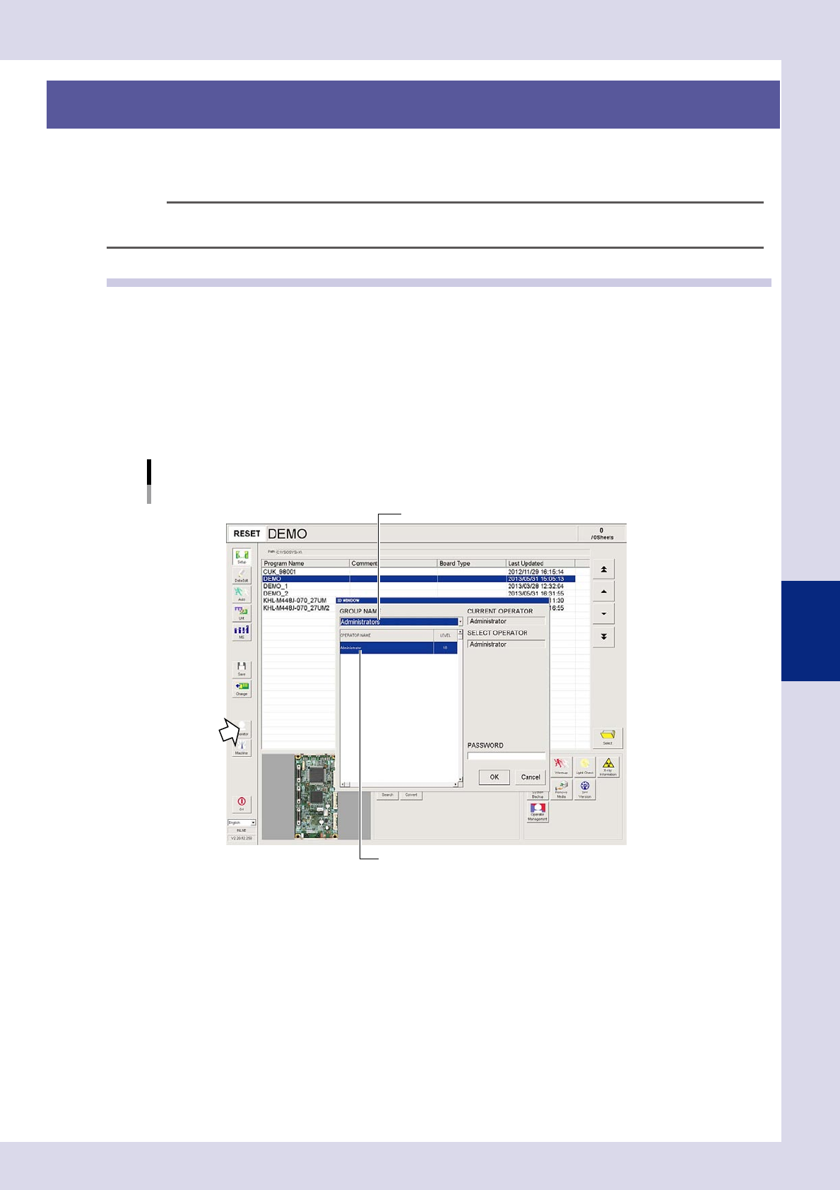 All machine operations are restricted by password. This section describes operator registration and editing,