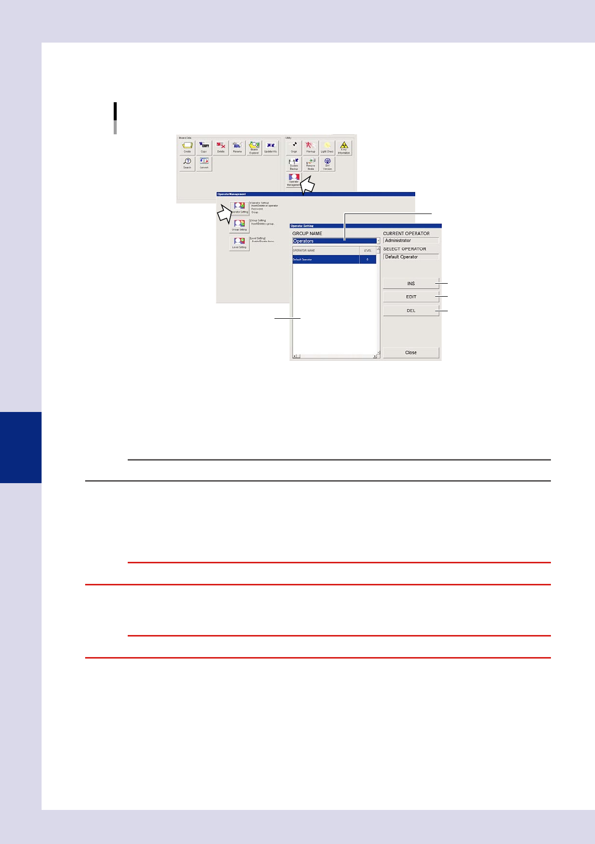 This section describes how to register a new operator, make group settings, and set an access level and
