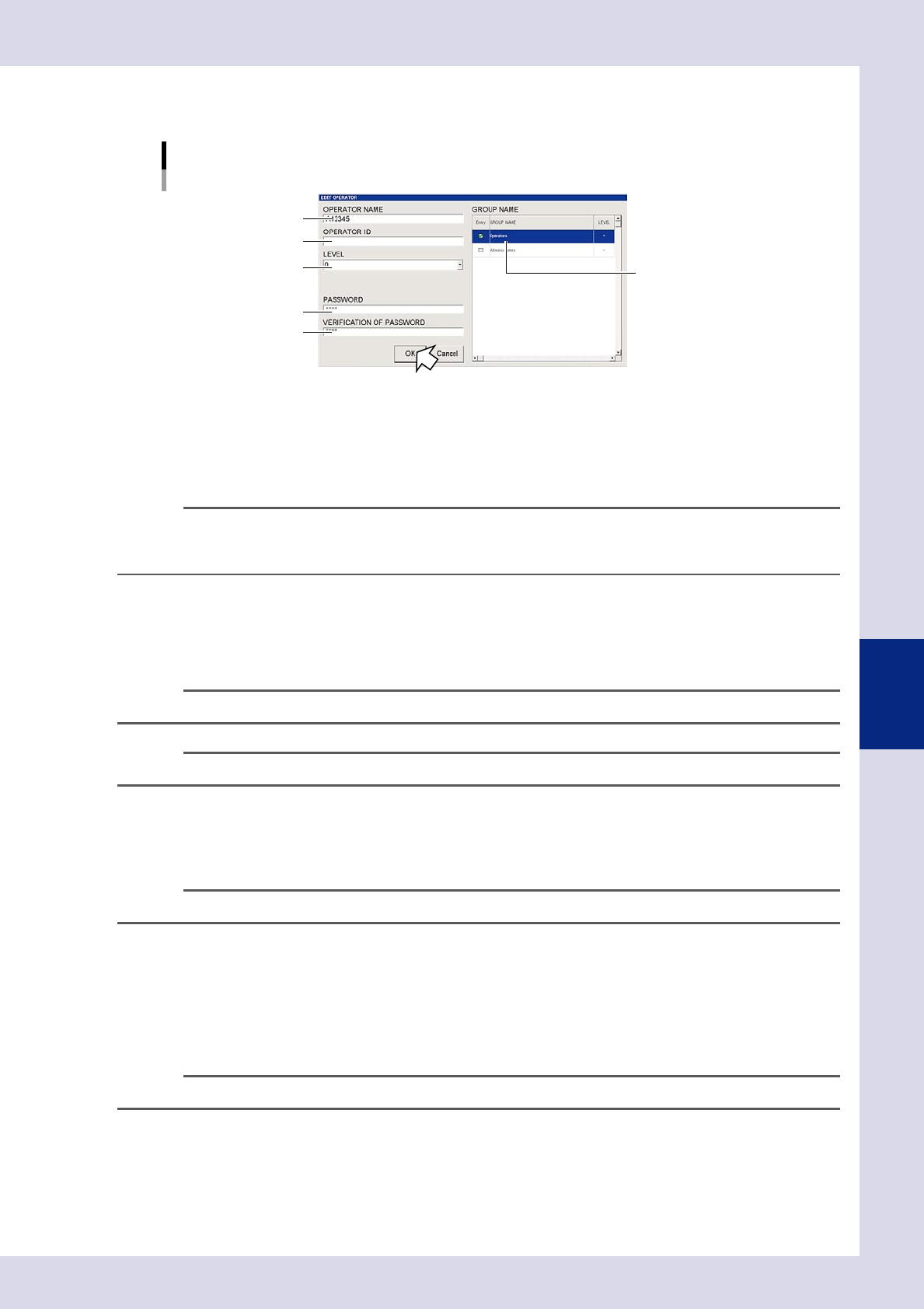 5-3 5 Inspection machine settings 4 Pr ess the [INS] button to register an operator . The "EDIT OPERA TOR" sc reen appears. Set each item as explained below. "EDIT OPERA T OR" screen 1 4 3 5 6 2 24503…