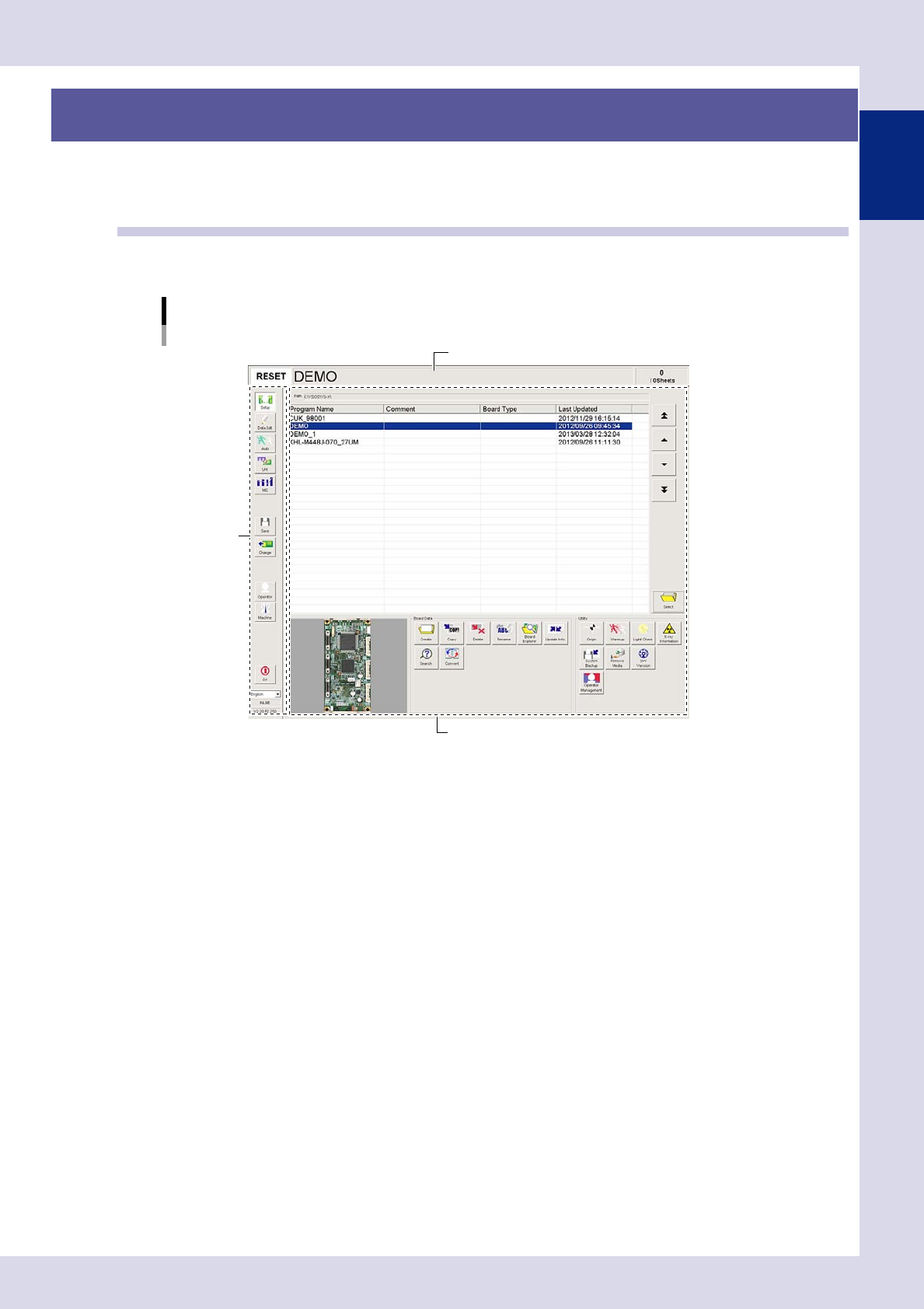 Displays the current machine status on the left end, the selected inspection program name in the middle, and the number of boards