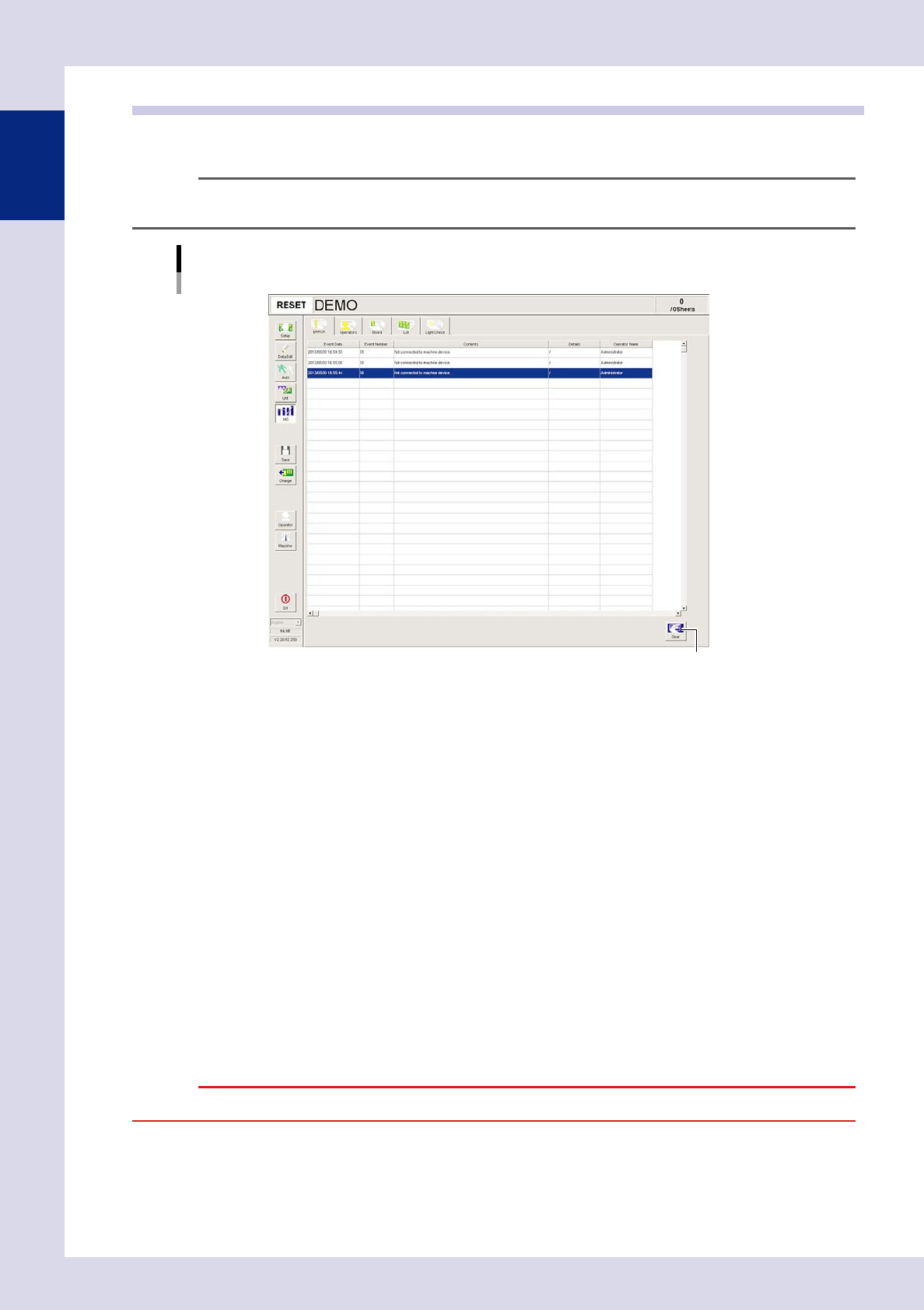 Use this button to delete all log data currently displayed on the screen. Data cannot be deleted in rows.