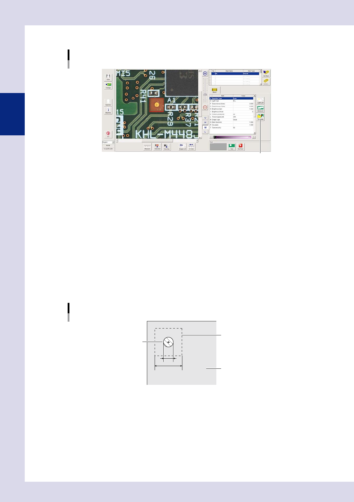 Press the [Measure] button and enclose the mark by dragging the mouse. The recognized circularity is set and a test is