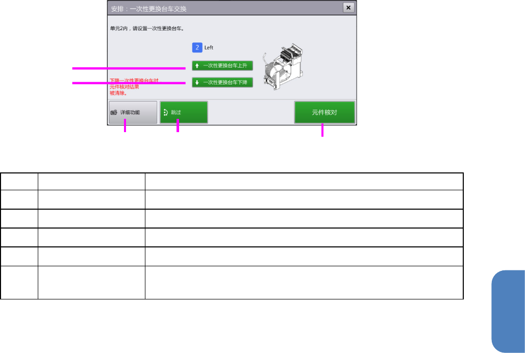 一次性更换台车上升 在显示的对话框中触摸[上升]后,将使一次性更换台车上升并固定。
