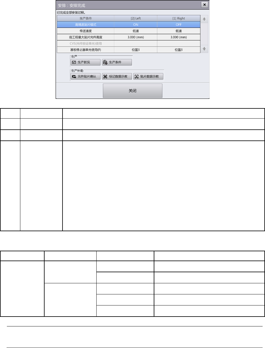 第 4 章 操作 篇 4- 3. 生产 36 [ 安排 : 安排 完成 ] 对话框 在 [ 支援准备 ] 菜单 中触摸 [ 自动执行 ] 后,如果安排 的全部工序都完成,将 显示 [ 安排:安排完成 ] 对话框。 记号 名称 说明 (a) 画面切换按钮 完成所有 的支援准备, 切换为对应的画面显 示。 (b) 关闭 完成所有的支援 准备,返回 [ 支援准备 ] 画面的显示。 (c) 生产条件 显示贴片精度等 影响生产节拍 的生产条件…