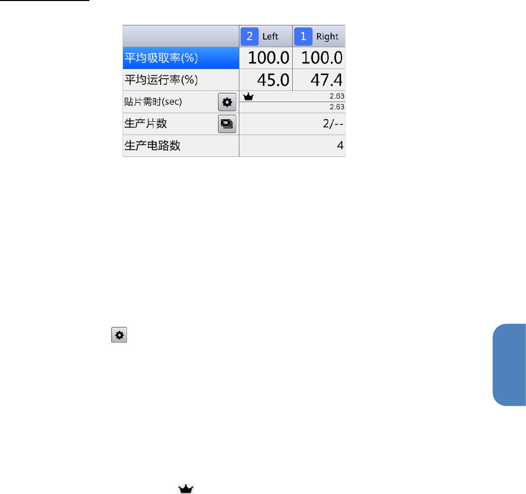第 4 章 操作 篇 4- 3. 生产 41 4 显示生产进度状况 生产时的进度状 况可通过生产 管理信息列表确认。 平均 吸取率 (%) 显示装置 1 和装置 2 的平均吸取率。 更改 了生产分组,或在未指定 生产分组的情 况下切换生产程序时 ,会进行重置。 平均 运行率 (%) 显示 单元 1 和 单元 2 各装置的 平均运行率。 更改生产分组, 或在未指定生 产分组的情况下切换 生产程序时,会进行 重置。 需时 (se…