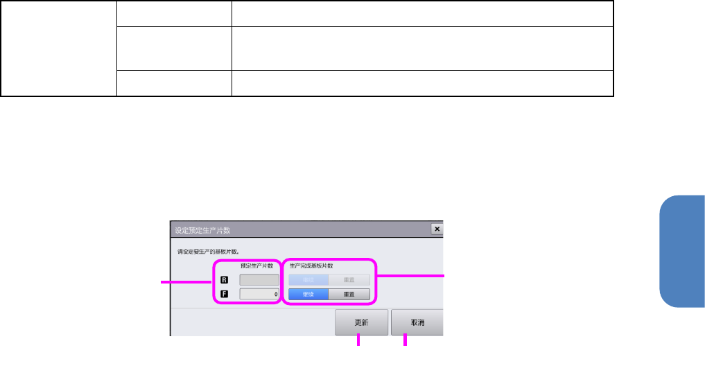 预定生产片数 输入设定的生产片数。如果输入 0,则表示无限制,不会自动停止。