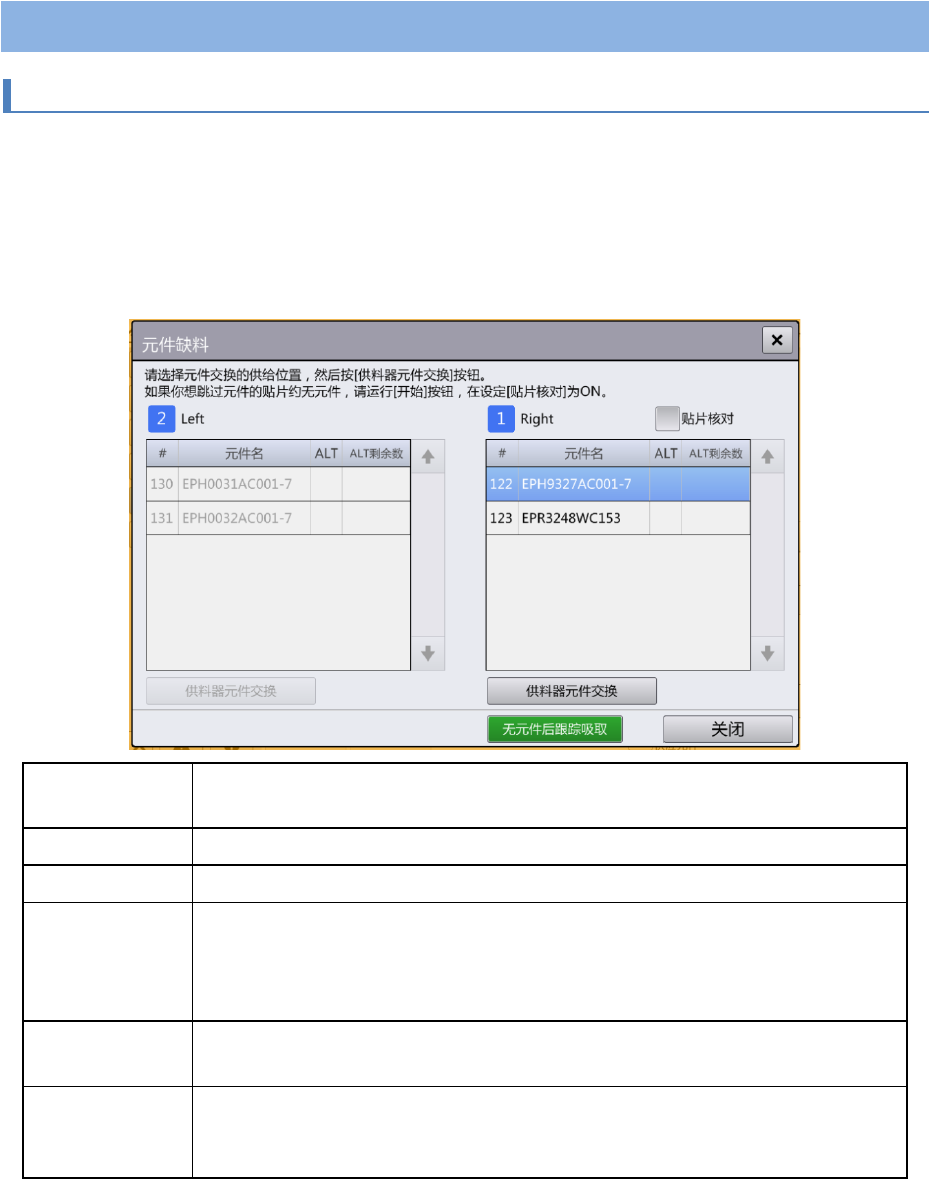 元件缺料对话框是指,显示不同装置在生产过程中发生的无元件状态,并通知单元整体的无元件状况,然
