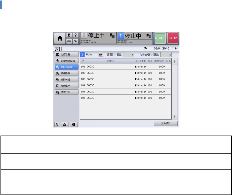 触摸[安排]画面子菜单面板中的[供料器设置],显示[供料器设置]画面。