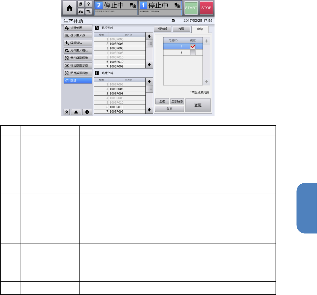 第 4 章 操作 篇 4- 6. 生产补助 126 跳过画面的基本操作 供给部 的跳过 触摸 [ 供给部 ] 选项卡,在显示 的供给部跳过列表上 ,进行勾选,触摸 [ 跳过 ] 后, 即 根据 该 勾选 过的 供 给部 贴片步骤,生产时予以跳 过。 贴片资料中的跳过 触摸 [ 步骤 ] 选项卡,在 显示的步骤跳过列表 上, 勾选 步骤编号,触摸 [ 变更 ] 后, 即会将该勾选的 未设 定跳过编号的 贴片 步骤,在生 产时予以跳…