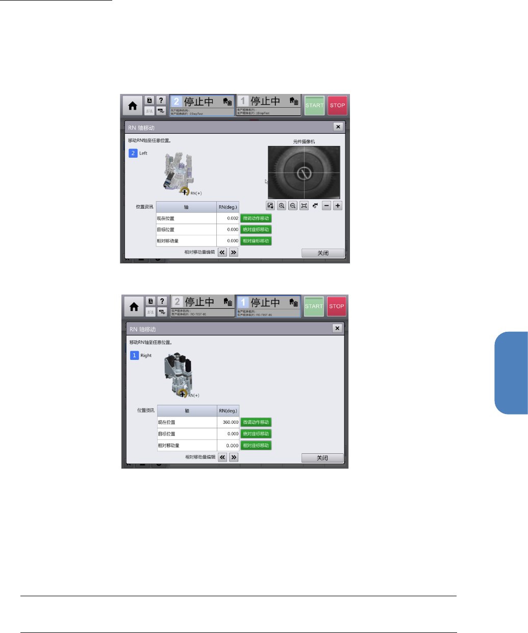 第 4 章 操作 篇 4- 9. 手动控制 175 4 吸嘴 RN 轴的绝对移动 触摸 [ 贴片头控制 ] 画面的 [ RN ] ,显示 [ RN 轴移动 ] 对话框。 贴片头类型为高 速时,旋转吸 嘴,移动到任意位置 ,确认元件摄像机中 显示的吸嘴前端状态 。 [ 位置资讯 ] 的 [ 现在位 置 ] 中将显示 RN 轴的当 前角度。 贴片头类型为高速时 贴片头类型为通用时 1 触摸 [ 目标位置 ] 文本框,输入旋转角度。 …