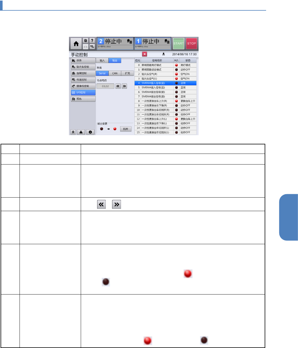 在顶部菜单中按[手动控制] - [I/O 控制]的顺序触摸后,将显示[I/O 控制]画面。