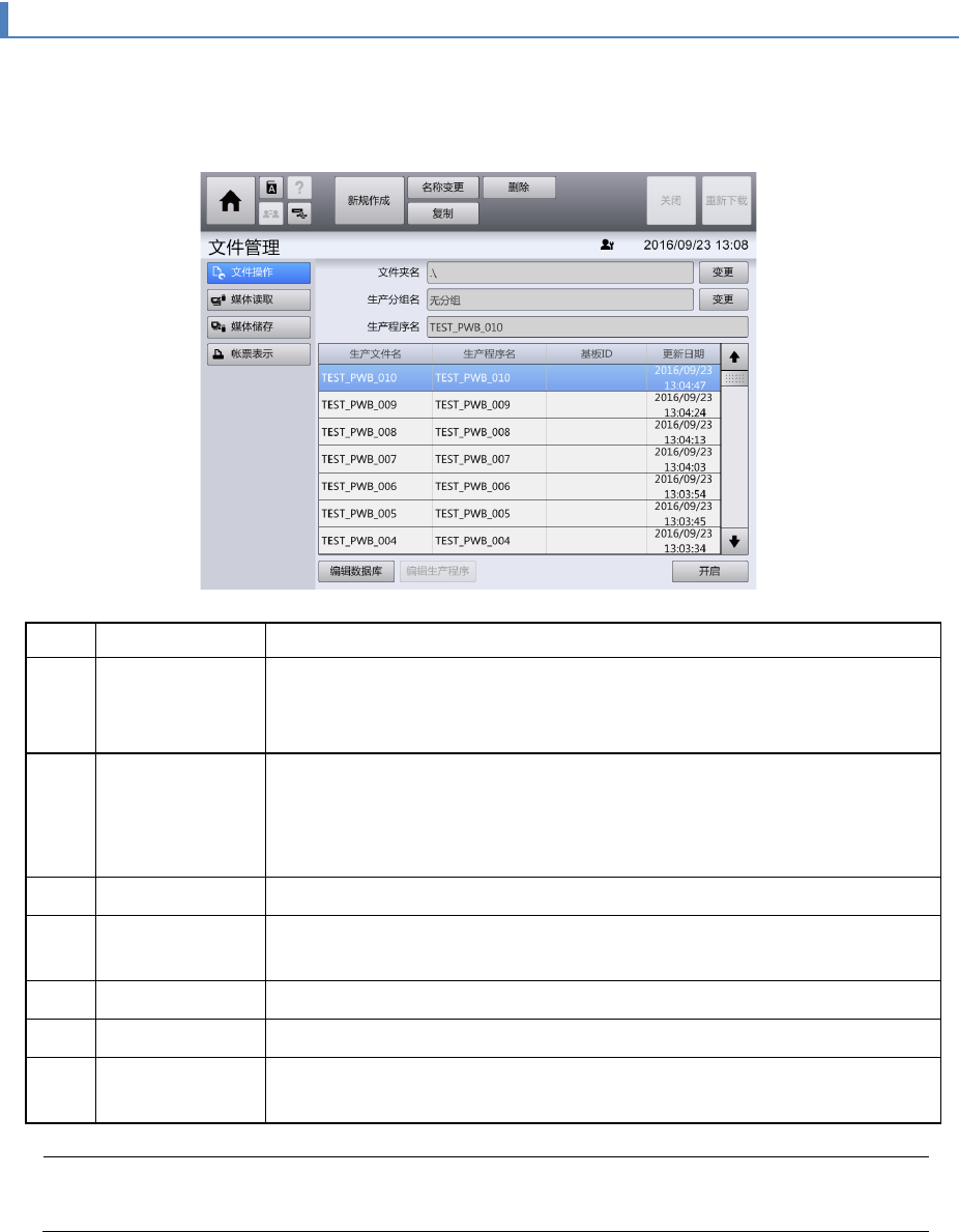 第 4 章 操作 篇 4- 10. 文件管理 200 4- 10 - 2. 文件操作 文件操作画面的作用 在 [ 文件操作 ] 画面中,对 [ 编辑生产程 序 ] 菜单 中处理的文件输入进行管理 。可选择对象数据后 编辑。 触摸 [ 文件 管理 ] 子菜单面板中的 [ 文件 操作 ] ,即 显示 此画面。 记号 名称 说明 (a) 文件夹名 显示保存生产程序的文 件夹名称。 触摸 [ 变更 ] 显示 [ 文件 夹变更 ] 对话框,可…