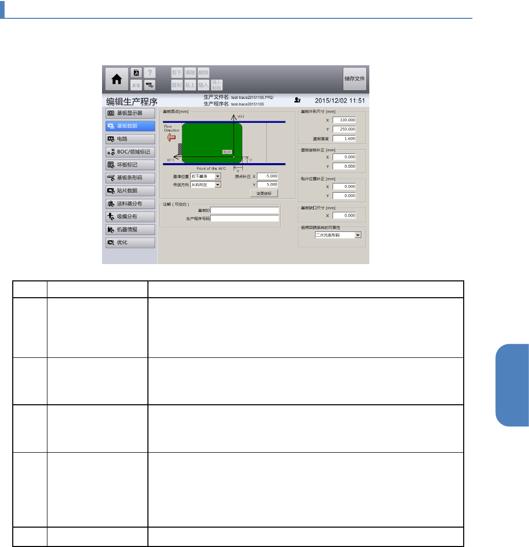 触摸[编辑生产程序]画面左侧的子菜单面板中的[基板数据],显示[基板数据]画面。