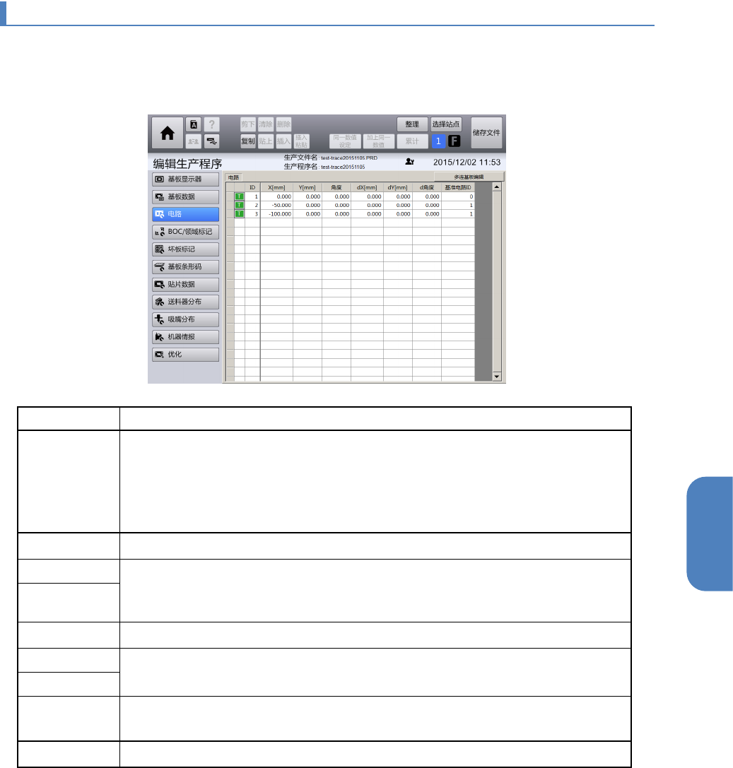 触摸[编辑生产程序]菜单画面左侧的子菜单面板中的[电路],显示[电路]画面。