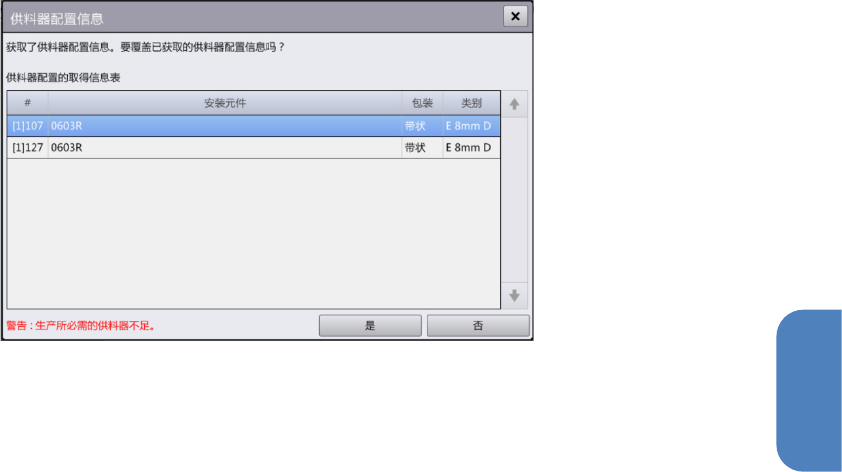 ※这时,将以红色字符显示「警告:生产所必需的供料器不足。」警告提示信息。