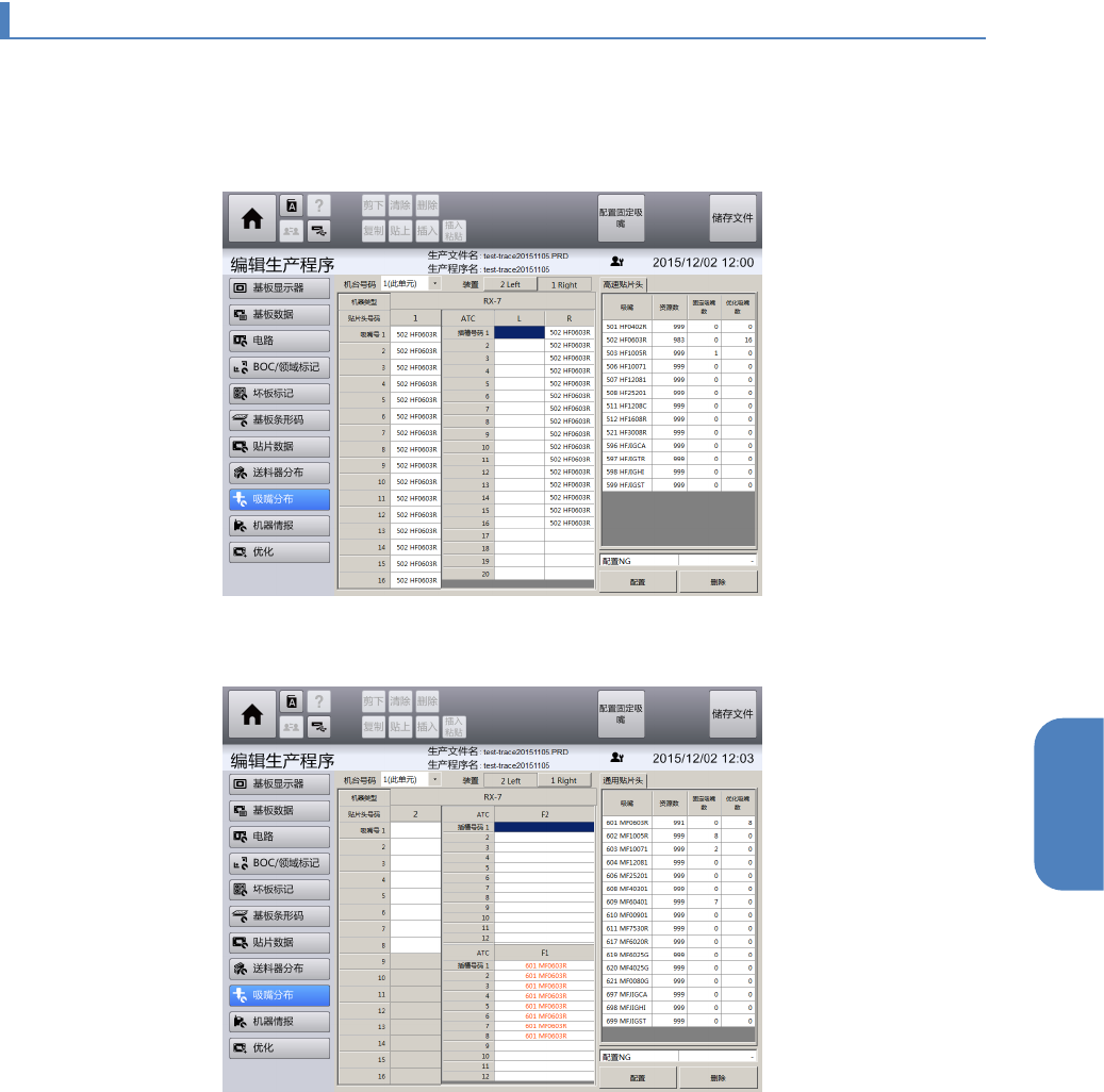 第 4 章 操作 篇 4- 11. 编辑生产程序 249 4 4- 11 - 10. 吸嘴分布画面 触摸 [ 编辑生产程序 ] 菜单画面 左侧的子菜单面板中 的 [ 吸嘴分布 ] ,显示 [ 吸嘴分布 ] 画面。 贴片头类型为高速时 贴片头类型为通用时