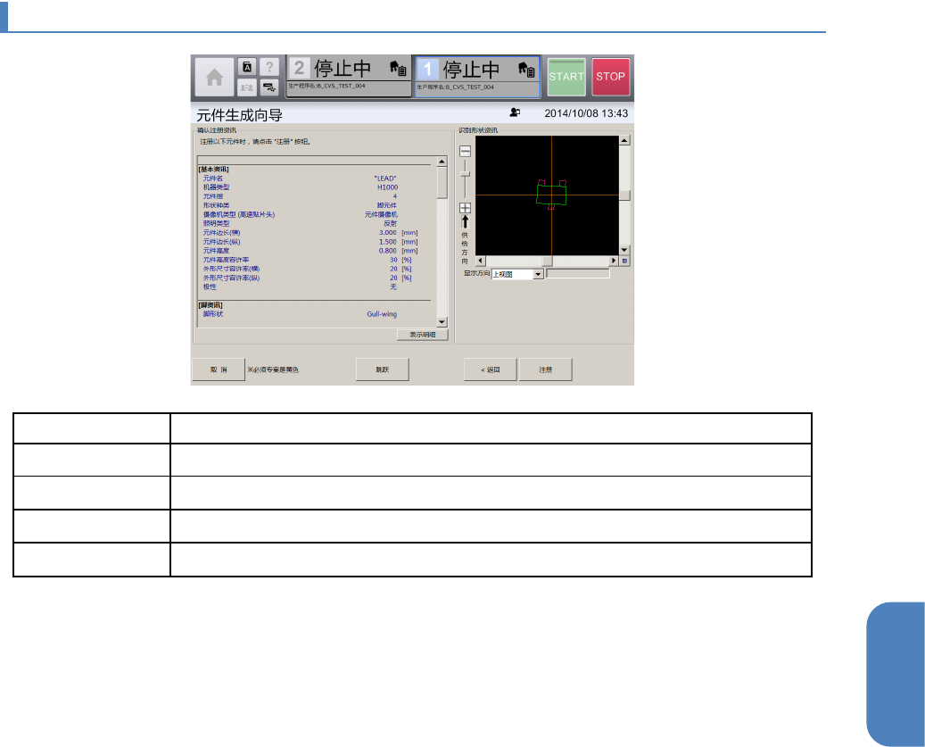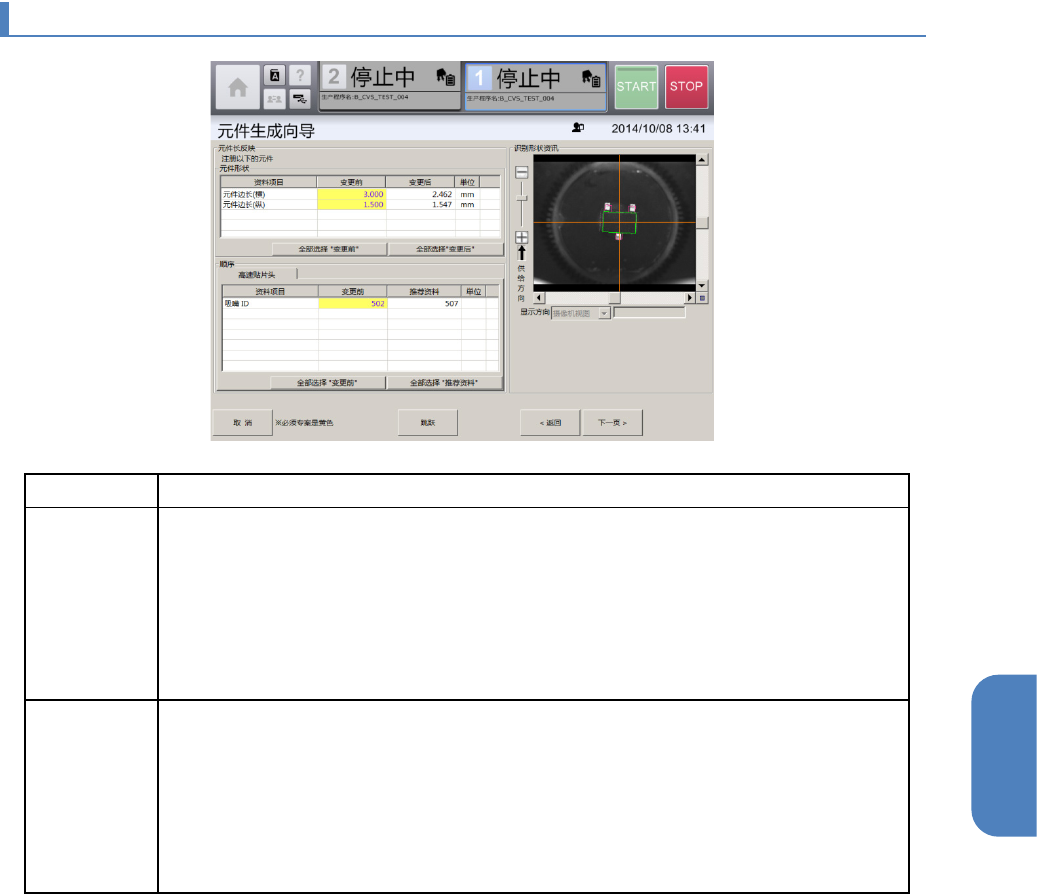 第 4 章 操作 篇 4- 13. 元件生成向导 312 4- 13 - 8. 元件废弃 画面 在 [ 吸取、废弃 ] 画面中吸取元件后, 为了进行元件 的废弃,会再次显示 [ 吸取、废弃 ] 画面 的 [ 元件废弃 ] 选项 卡。 记号 名称 说明 (a) 废弃方法 通过下拉 列表选择元件 的废弃方法。 • 废弃盒:自动将 元件废弃到废 弃盒。 • 手动废弃:手动 从吸嘴将元件 取下。 (b) 废弃执行 废弃吸取 的元件。 在 [ 废…