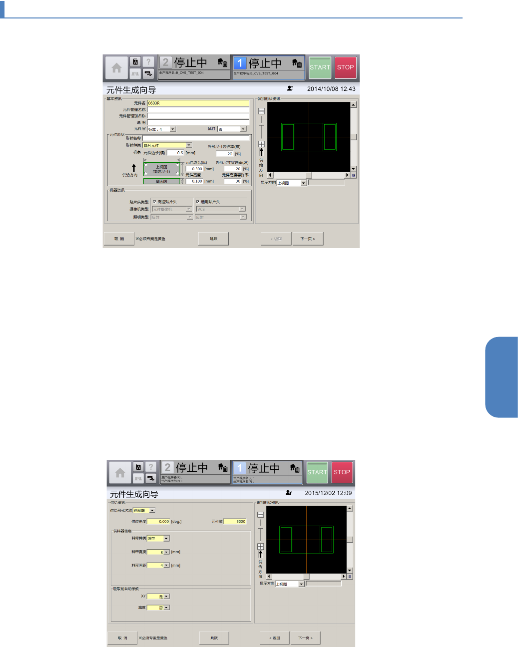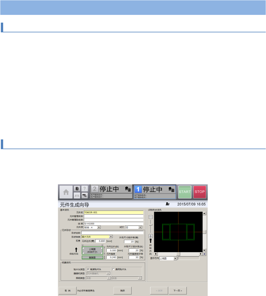 第 4 章 操作 篇 4- 14. 数据制作步骤 315 4 4- 14 - 3. 制作晶片 元件 的数据 1 显示 [ 元件生成向导 ] 。 2 输入 [ 元件名 ] 。 输入任意的元件 管理 名称 , 元件 管理别名称,说明。 3 在 [ 形状种类 ] 中选择 [ 晶片元件 ] 。 输入任意的形状 名称,外形 尺寸 ,容许率。 4 选择元件的贴片中使用的 [ 贴片头类型 ] 。 使用 根据元件的尺寸选择的贴 片头,有时不 能生成元件…