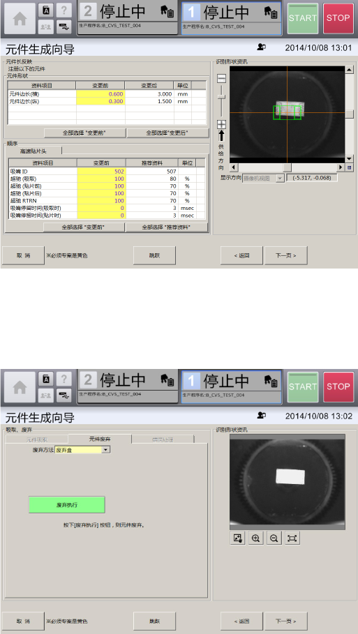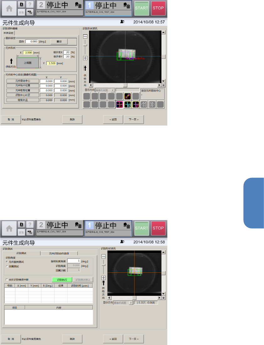 第 4 章 操作 篇 4- 14. 数据制作步骤 317 4 10 触摸 [ 下一页 ] 。 显示 [ 识别数据编辑 ] 画面。 11 输入 [ 识别资料编辑 ] 画面中的 [ 本体设定 ] 的各项目。 12 触摸 [ 下一页 ] 。 显示 [ 识别 测试 ] 画面。 [ 识别测试 ] 选项卡,可 在 [ 吸取、废弃 ] 画面 中吸取有元件时,使用 [ 识别资料编辑 ] 画面中制作的元件 识别 数据,对元件进行识别 测试 。 [ 元件识…