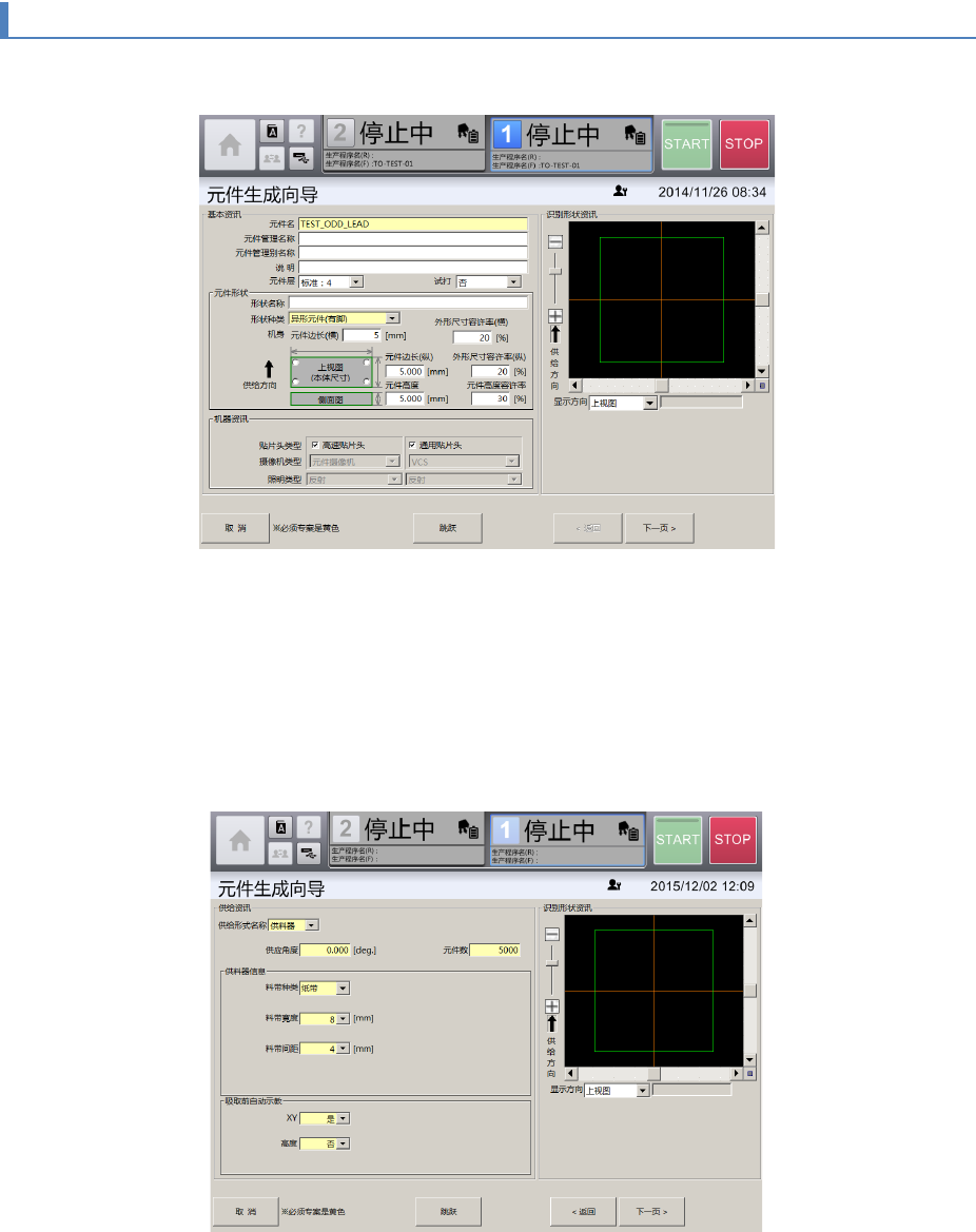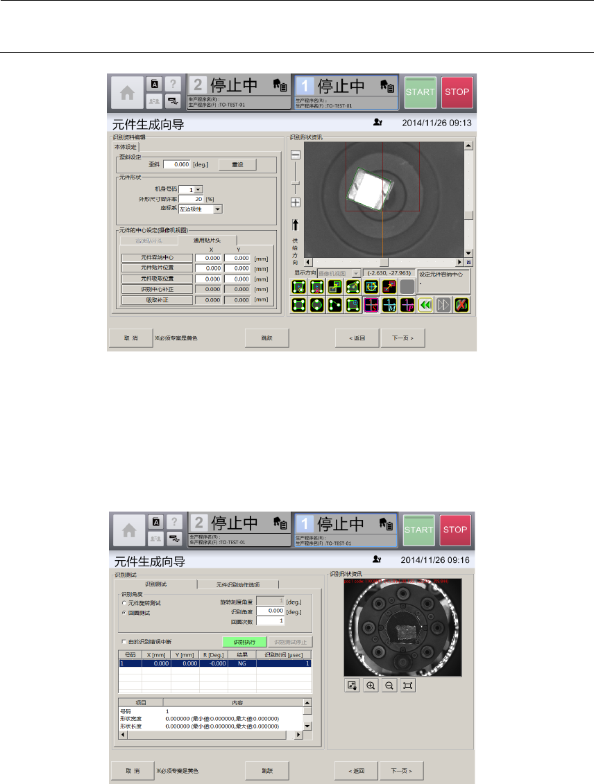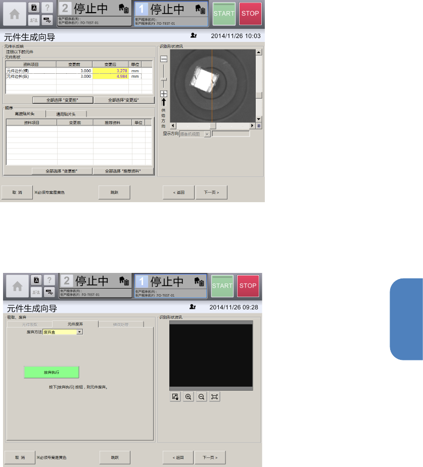 第 4 章 操作 篇 4- 14. 数据制作步骤 333 4 11 触摸 [ 下一页 ] 。 在 [ 基本信息 ] 画面中,变更 [ 元件形状 ] 的元件边长(横)或 元件边长(纵),吸 嘴 ID 或超驰等推荐 数据发生变更时 ,会显示 [ 元件 ( 边 ) 长反映 ] 画面。请选择 变更前及推荐数据中 注册的值。 12 触摸 [ 下一页 ] 。 贴片头吸取元件 时,会显示 [ 吸取、废弃 ] 画面 。 废弃 吸取中的元件。 13 触摸…
