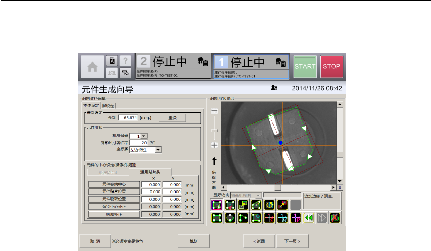 第 4 章 操作 篇 4- 14. 数据制作步骤 337 4 12 触摸 [ 下一页 ] 。 显示 [ 识别 测试 ] 画面 。 [ 识别测试 ] 选项卡,可 在 [ 吸取、废弃 ] 画面 中吸取元件时,使用 [ 识别资料编辑 ] 画面中 制作的元件识 别数据,对元件 进行识别测试 。 [ 元件识别动作 选项 ] 选项卡,可对元 件识别功能或 背面贴片检测功能的 详细参数进行设定。 13 触摸 [ 下一页 ] 。 在 [ 基本信息 ] …
