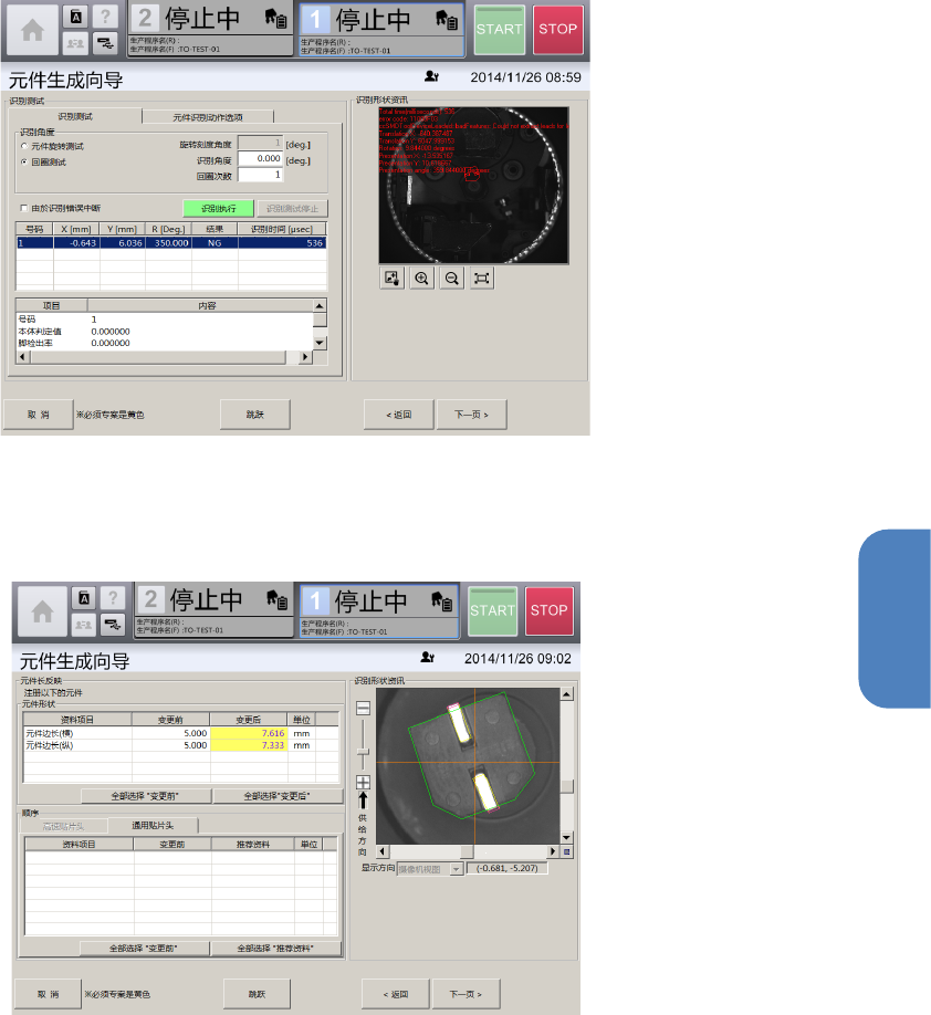 第 4 章 操作 篇 4- 14. 数据制作步骤 338 14 触摸 [ 下一页 ] 。 在贴片头吸取元 件时,会显示 [ 吸取、废弃 ] 画面。 废弃 吸取中的元件。 15 触摸 [ 下一页 ] 。 显示 [ 确认注册信息 ] 的确认画 面。 触摸 [ 表示明细 ] ,即显示注册 元件的详细信息。 16 触摸[注册],注册元件。 结束元件生成向 导,返回 [ 编辑数据库 ] 画面,元件 注册即告完成。