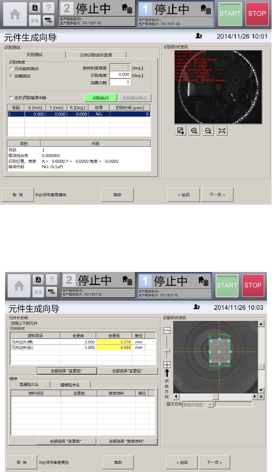 第 4 章 操作 篇 4- 14. 数据制作步骤 342 12 触摸 [ 下一页 ] 。 显示 [ 识别 测试 ] 画面。 [ 识别测试 ] 选项卡,可 在 [ 吸取、废弃 ] 画面 中吸取元件时,使用 [ 识别资料编辑 ] 画面中 制作的元件识 别数据,对元件 进行识别测试 。 [ 元件识别动作 选项 ] 选项卡,可对元 件识别功能或 背面贴片检测功能的 详细参数进行设定。 13 触摸 [ 下一页 ] 。 在 [ 基本信息 ] 画面中…